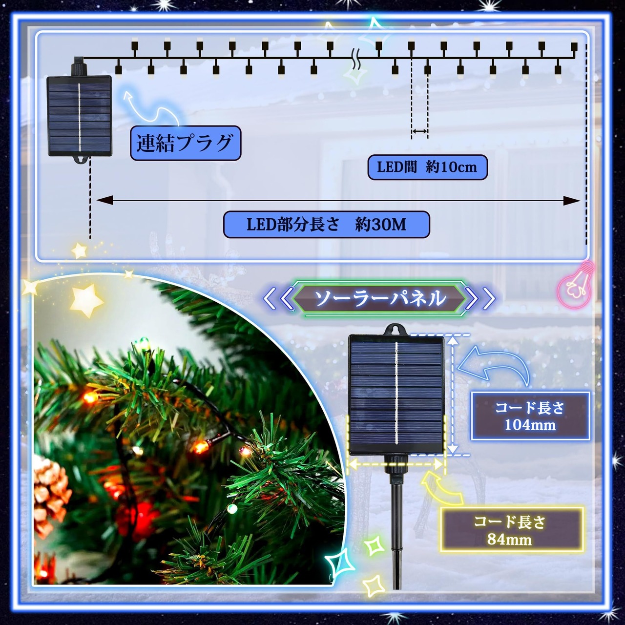 【大容量バッテリー】他社にない1800mAhバッテリーを採用。LED300球、長30M(電源コード200CM)合計32M、点灯モード8種類、IP44防水、ソーラー充電式。【ソーラー充電式】最新の太陽光充電式なので、電気代は0円!日当たりよい場所に置くだけで自動充電、自動点灯。設置後の操作は一切不要です。