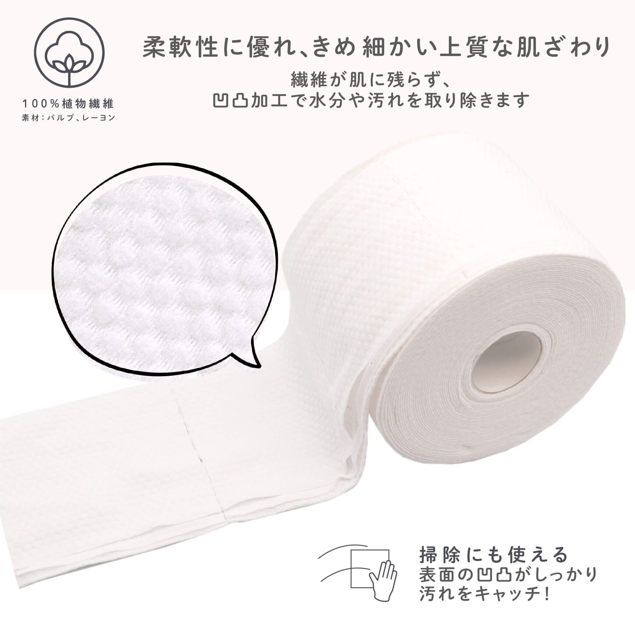 柔らかい肌触り・万能な使い捨てタオル コットンやタオルとしてミシン目でカットして使えるクレンジングタオルです 使い捨てタイプで、タオルの雑菌や汚れを気にすることなく清潔さを保つことができます