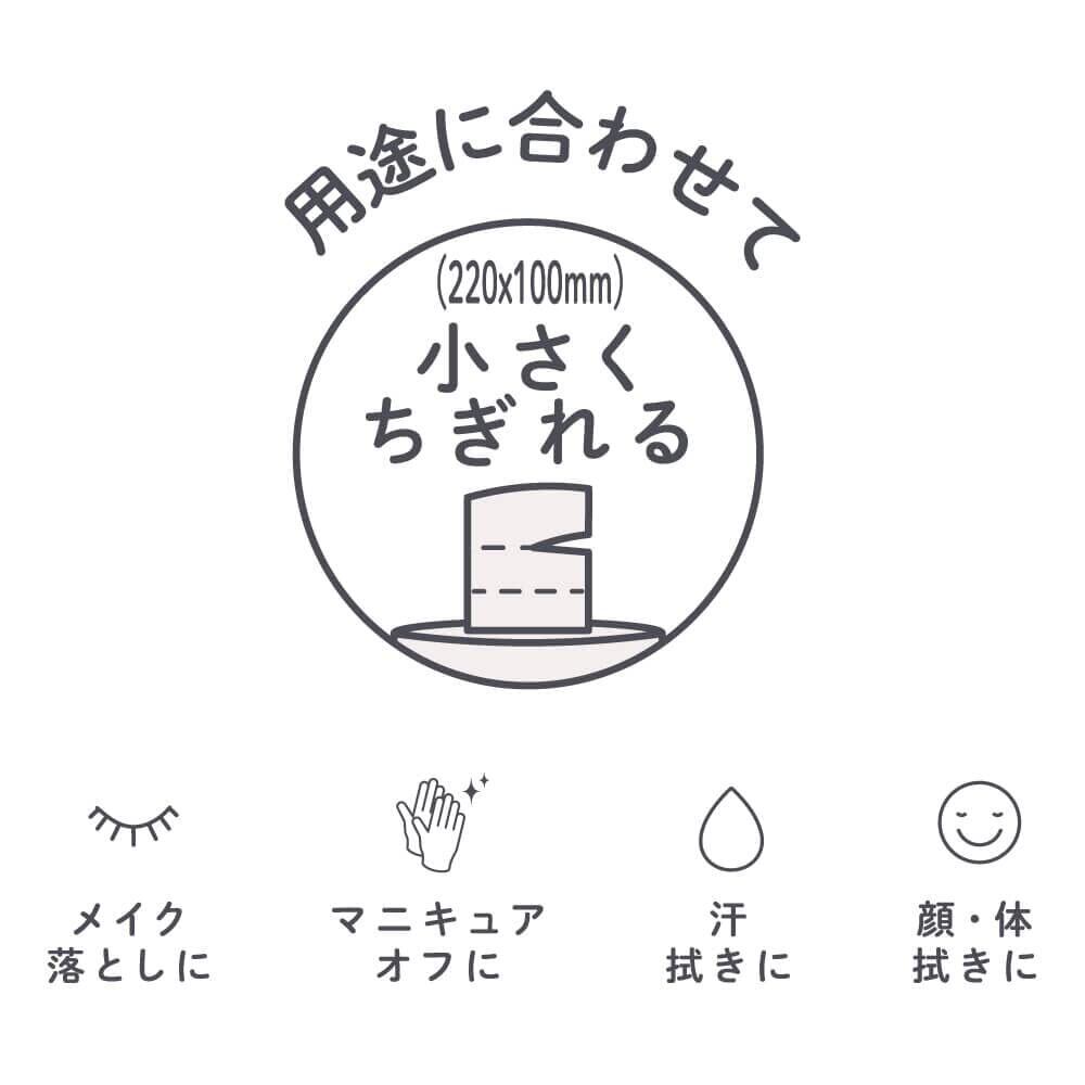 ●100%植物繊維(パルプ、レーヨン)を使用しているため吸水性に優れ、毛羽立たず繊維がお肌に残りません。 ●表面は凹凸加工がされており、小さめ(22cm×10cm)にもカットできることから、メイク落としやマニキュアオフの用途にも向いています。 ●洗面台などに置いていても圧迫感の少ないパッケージデザインです。 ●1ロール約148シート入り。