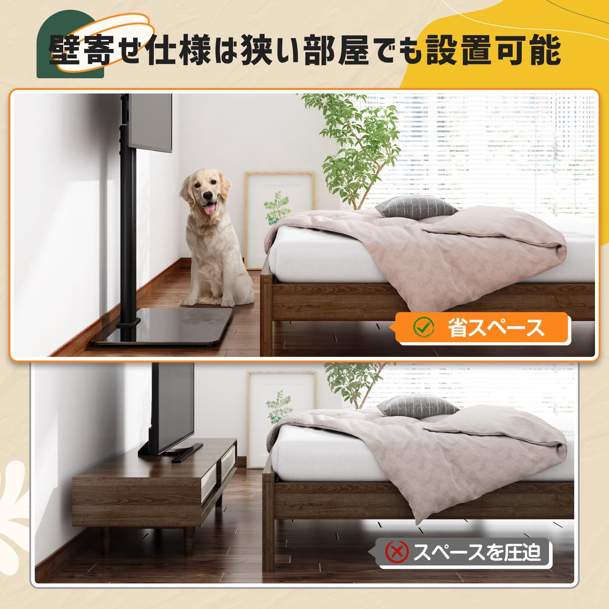 「便利的に高さ調節・左右回転可能」高さ3段調節伸縮することで、異なる身長のユーザーがテレビの高さに対する要求を完璧的に満たします。また、左右方向へ±25°回転することができるので、最適な調整角度で調整し、いろんな視角からの観賞を満たします。リビングルームだけでなく、キッチンや寝室に居ても、回転角度によって、素晴らしい瞬間を見逃しません。床座りと座椅子の低い位置に、お昼ご飯時に、家族と一緒に楽しみ時間を過ごします。
