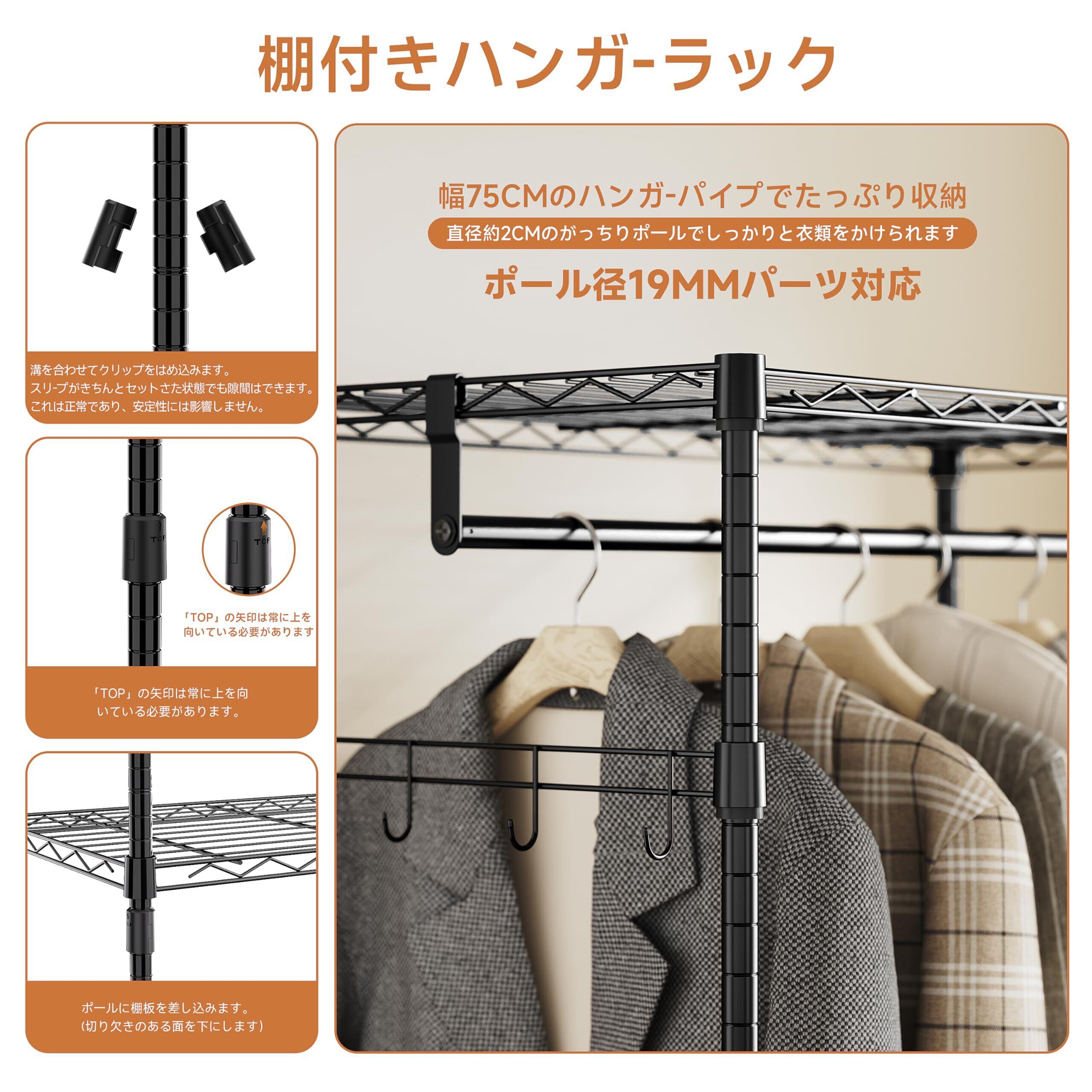 【サイズ&素材】幅75×奥行40×高さ189.3cm(車輪を含む高さ) 管径19.1m。全体耐荷重255kg。パイプハンガーラックは高品質の碳素钢を使用した高強度なパイプで、防錆性や耐摩耗性にも優れています。頑丈で耐久性があります。頑丈なスチール製安定感抜群のポール部分の耐荷重は40kg(静止)30kg(動く状態)、メッシュ耐荷重97.5kg、重さを気にせず幅いっぱいにどんどん掛けられる。侧面2個コート掛けフック付き、足元を支える連結部分もすべてスチールを使用しているため、重たい冬物のコートやジャケットを掛けても安心。衣服を掛けたり、他のアイテムを置いたりできます。