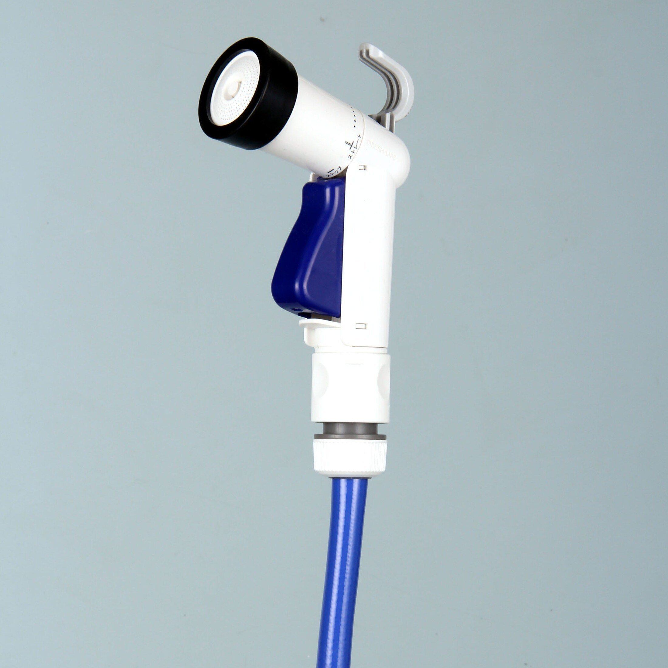 ノズルの先端を回転させて水形を切替可能(シャワー、ストレート、ジョウロ、カクサン、ストップ)。