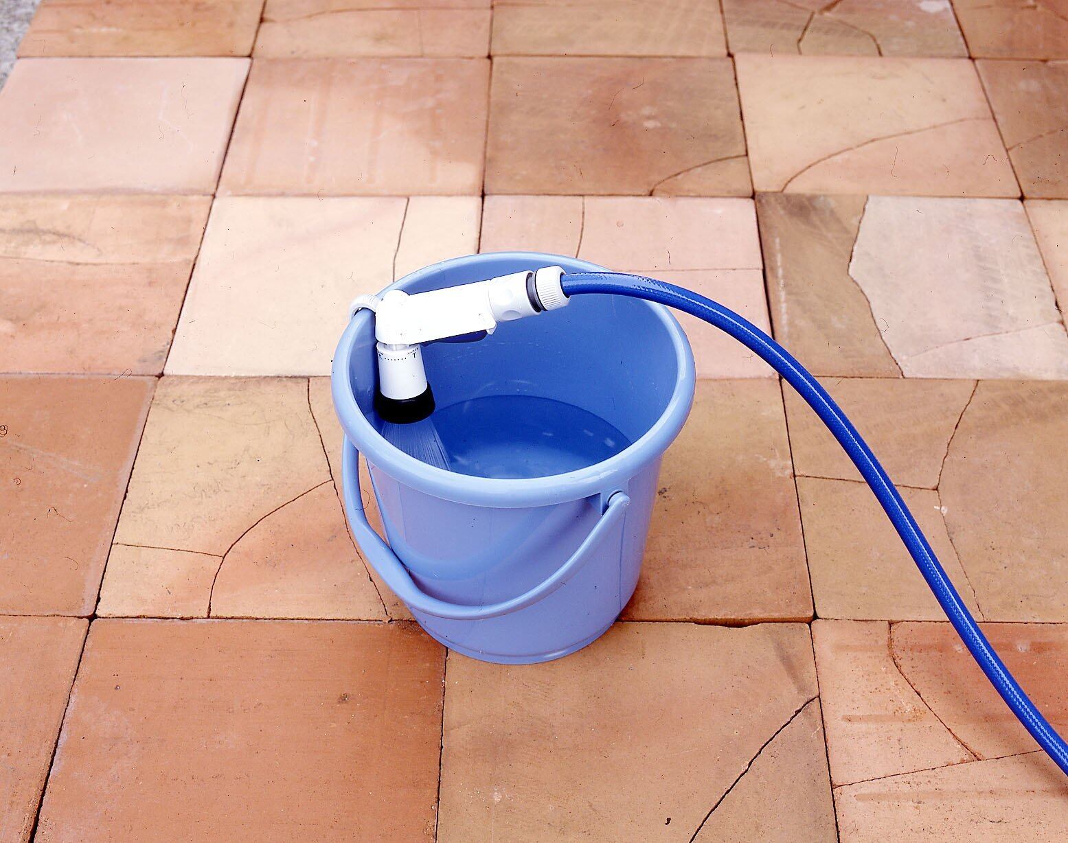 【ノズルがひっかけられる】ノズルはバケツの縁などにひっかけることができ、そのまま固定されるため、バケツの水溜めが簡単に行えます。