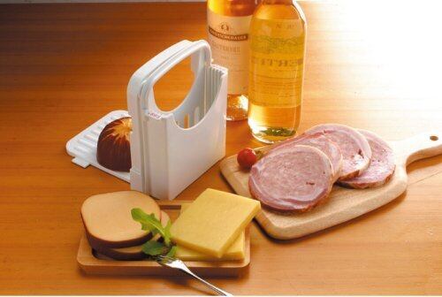 食パンをお好みの食感や用途に合わせて簡単にカットできるカットガイド。ホームベーカリーで作った山型パンにも対応。薄切り厚切り自由自在。厚み調整プレートで、食パンを5枚切(25mm)、6枚切(20mm)、8枚切(15mm)にカットできる。高さ約200mm、幅約140mmまでの食パンが切れる。食パンだけでなく、サンドイッチやハム、チーズなどにも使える。使用後はたたんでコンパクトに収納できる。