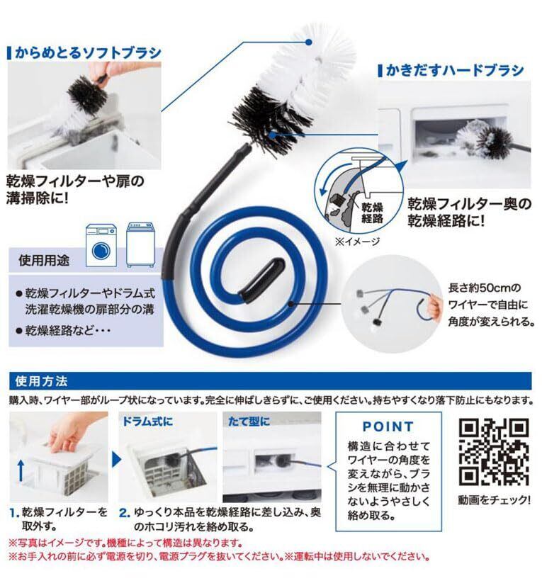 乾燥ムラがある・・・乾燥時間が長い・・・ 乾燥経路のホコリ汚れをお手入れ! ※機種によってご使用になれない場合があります。 ※無理にブラシを奥に入れると引っ掛かって取れなくなる場合があります。 からめとるソフトブラシ:乾燥フィルターや扉の溝掃除に! かきだすハードブラシ :乾燥フィルター奥の乾燥経路に! 長さ約50cmのワイヤーで自由に角度が変えられる。 使用用途 乾燥フィルターやドラム式洗濯乾燥機の扉部分の溝、乾燥経路など・・・ 使用方法 購入時、ワイヤー部がループ状になっています。完全に伸ばしきらずに、ご使用ください。持ちやすくなり落下防止にもなります。 ①乾燥フィルターを取外す。 ドラム式に、たて型に ②ゆっくり本品を乾燥経路に差し込み、奥のホコリ汚れを絡め取る。 POINT 構造に合わせてワイヤーの角度を変えながら、ブラシを無理に動かさないようやさしく絡め取る。 ※写真はイメージです。機種によって構造は異なります。 ※お手入れの前に必ず電源を切り、電源プラグを抜いてください。 ※運転中は使用しないでください。