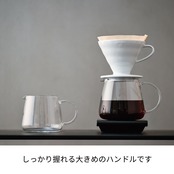 バリスタの声から生まれた持ちやすさ・混ぜやすさ・注ぎやすさにこだわったシンプルなサーバーです。液体の色を愉しめるように、側面から目盛りなどのプリントをなくしました。サーバーに溜まったコーヒーが美味しくみえるようにこだわったコロンとした可愛らしさと凛とした美しさを両立させたサーバーです。