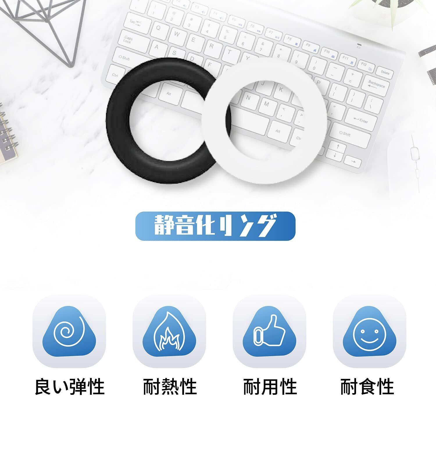 【適用と効能】:Cherry MX軸等多くの互換メカニカルスイッチ採用キーボードに対応、打鍵ストロークを約2mm浅くすることで、高速タイピング時のストレスを軽減、打鍵時のキーキャップとスイッチの接触音を軽減するOリング。