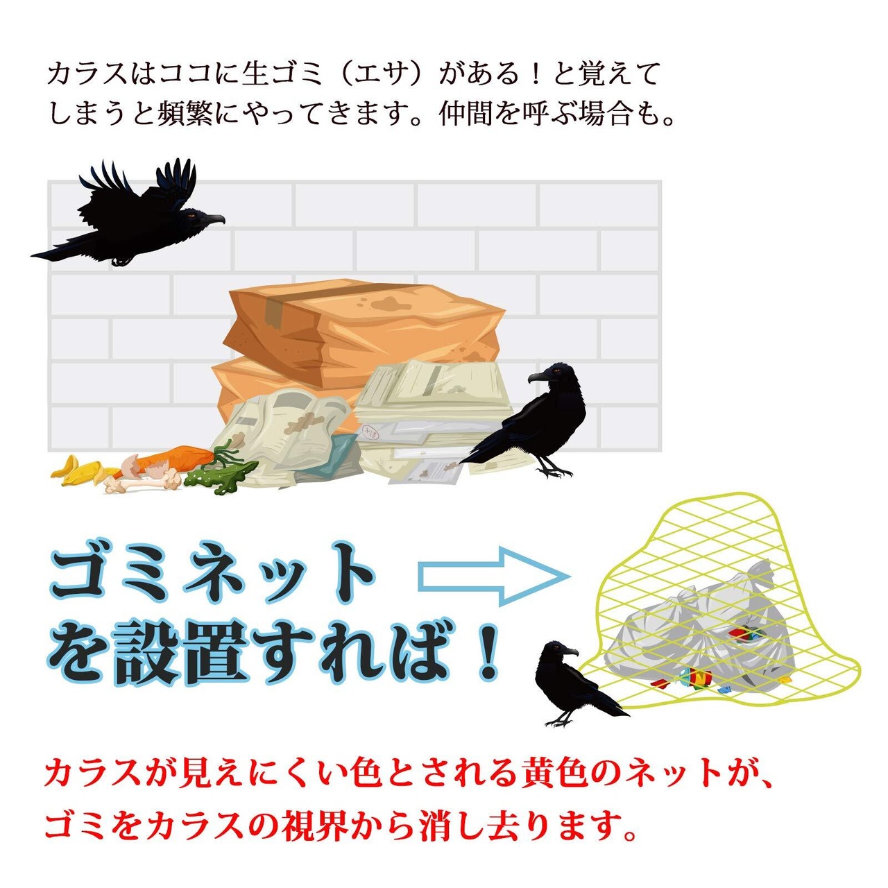 【設置簡単】対象のゴミ(ゴミ置き場)に上から被せるだけの非常に簡単な使用方法!まったごみ袋の上に被せるだけでカラス・犬・猫による生ごみの飛散防止に効果的です。