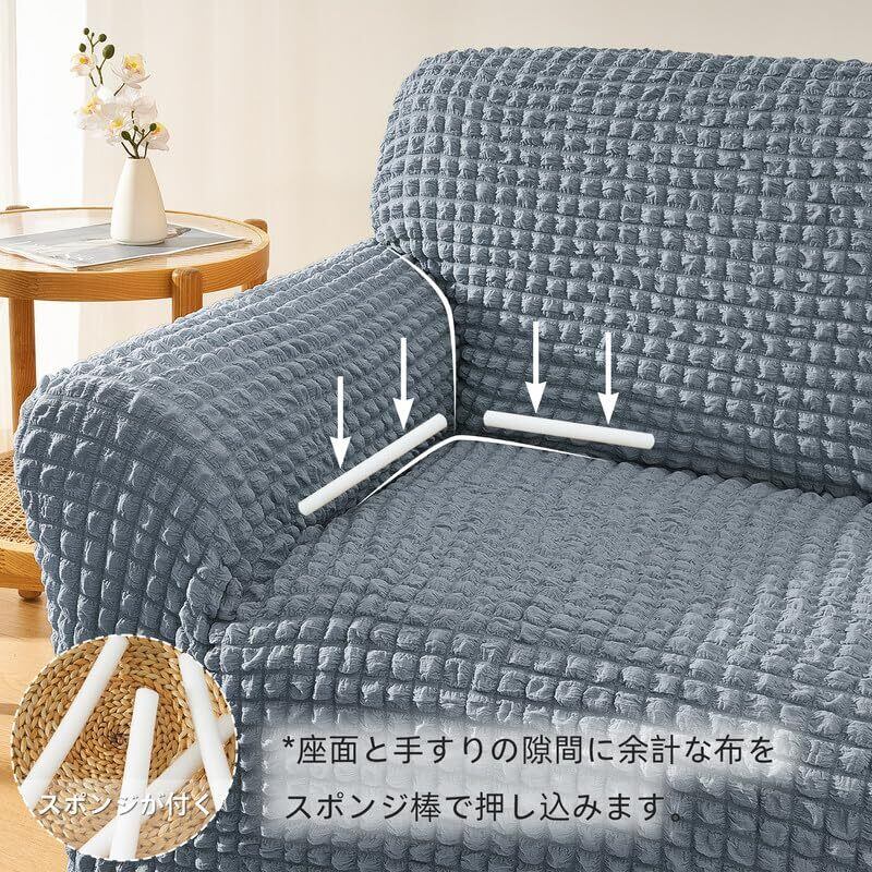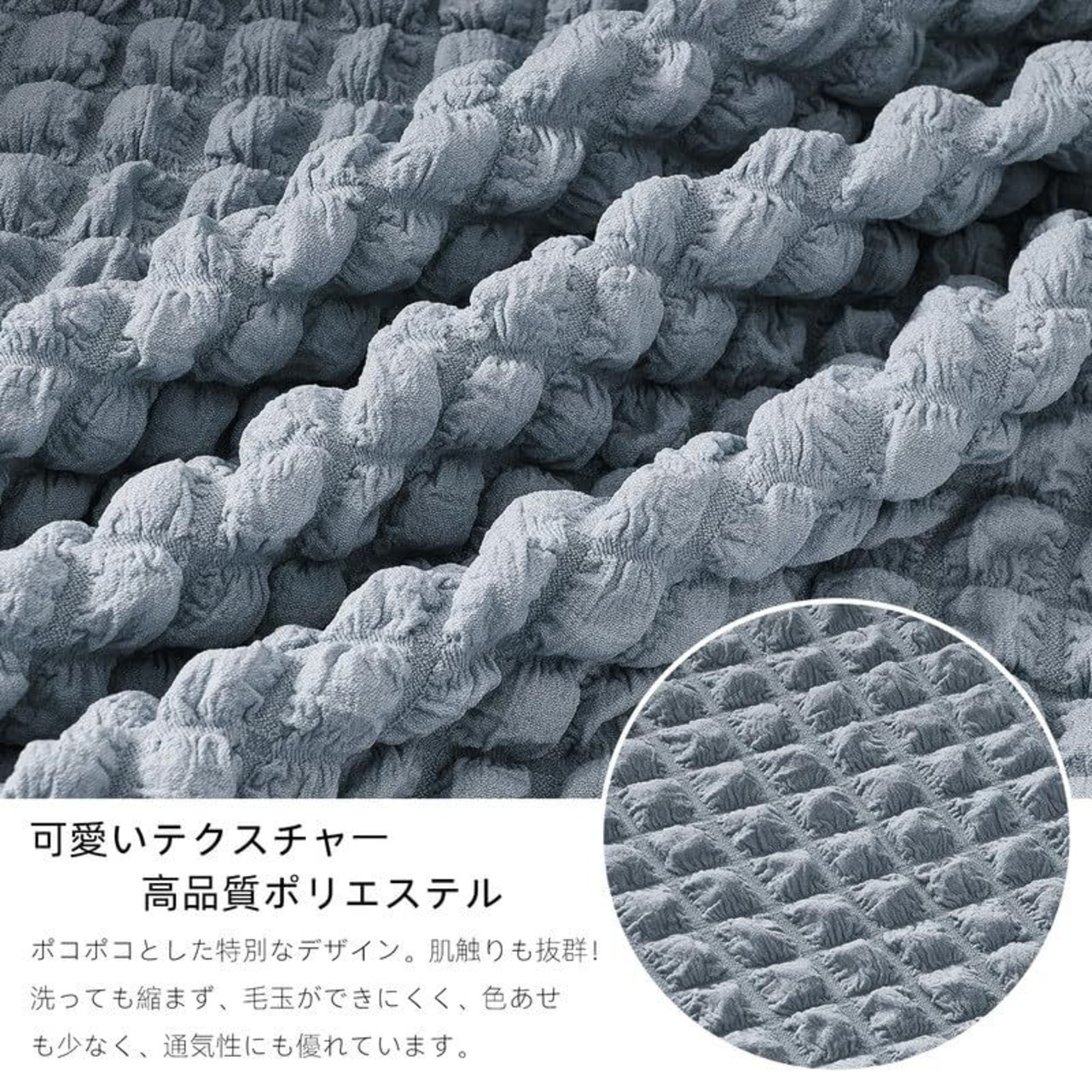 可愛くて高品質なポリエステル素材:ポコポコとした独特なテクスチャーが特徴で、丈夫でありながら柔らかく、肌触りも抜群です。キズや汚れを防ぎ、繰り返し洗っても縮まず、毛玉ができにくく、色あせも少なく、通気性にも優れています。弾力のある素材が様々な形やサイズのソファにしっかりフィットし、かけるだけソファカバー、ズレがない快適にお使いいただけます。長期間使用できる高品質な素材です。