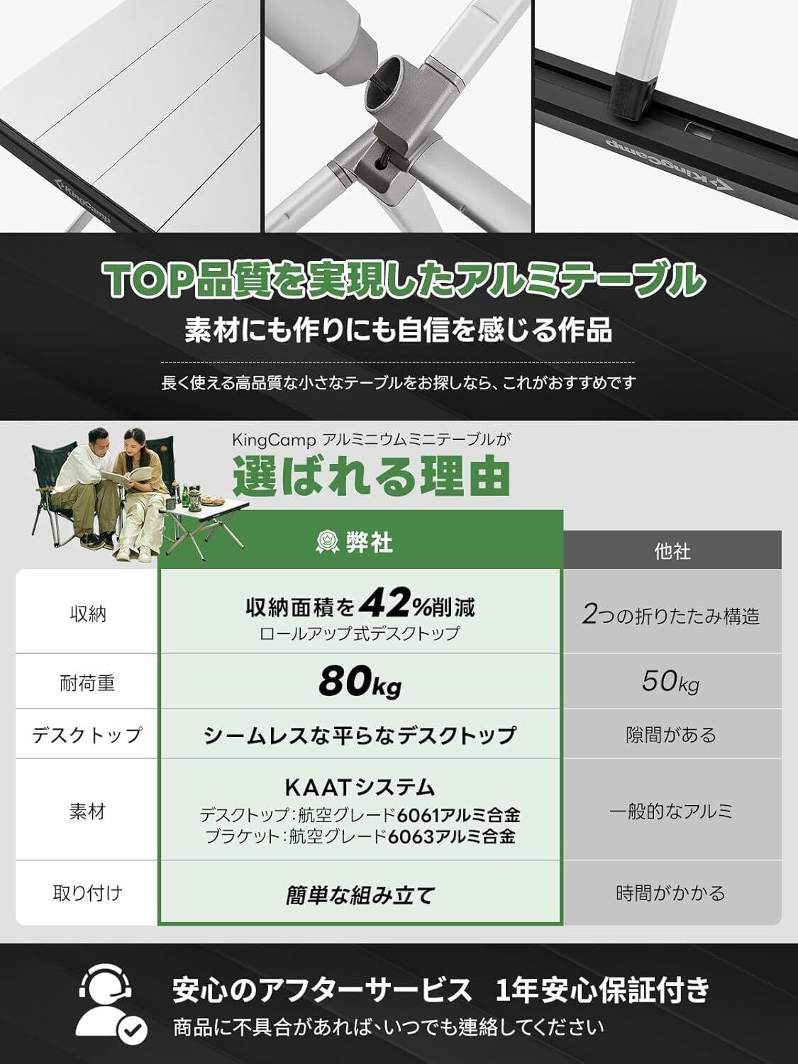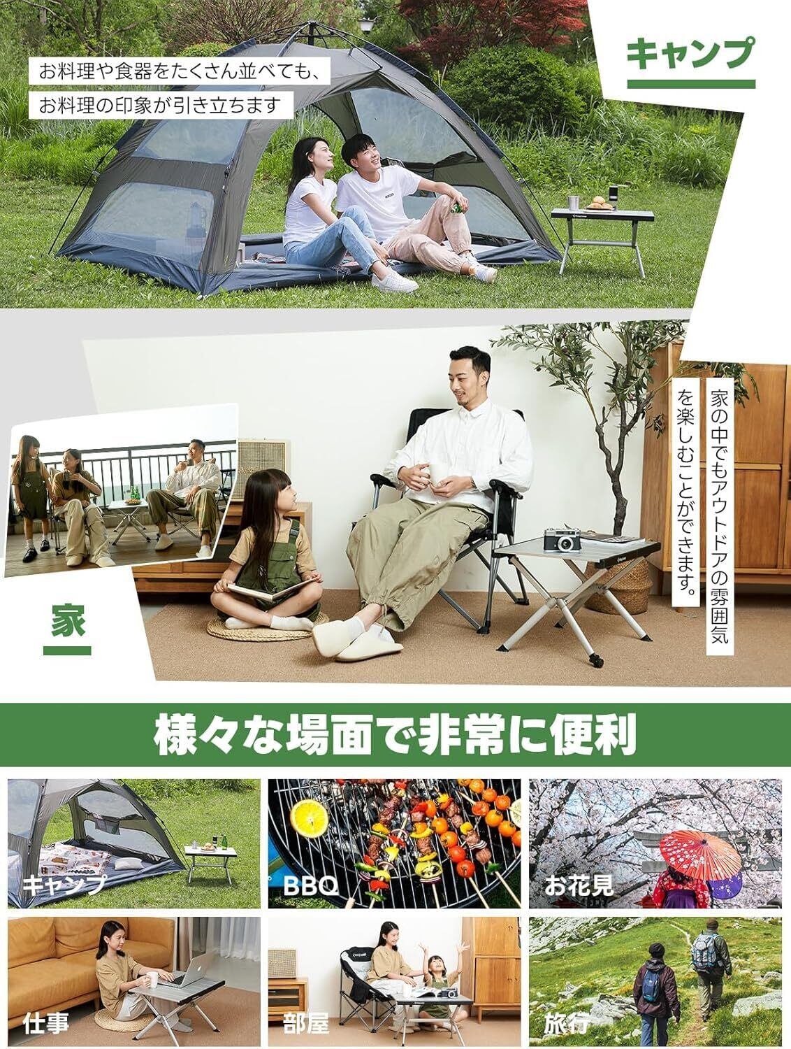 【アルミ製の高強度材質】フレームと天板が厚くサビに強い航空級アルミ製で、優れた強度と耐久性を兼ね備えています。熱や摩耗に強く、長時間使用しても変形や傷がつきにくいです。最大80kgまでの耐荷重設計により、安定性と信頼性が確保されており、キャンプや家庭など様々なシーンで安心使用できます。