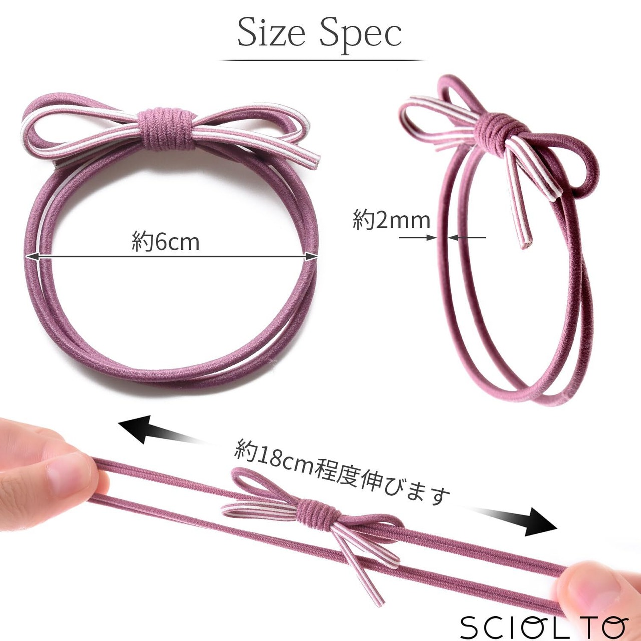 【ワンランク上の可愛いらしいリボンデザイン】2本のゴムを1つに合わせ、リボン結びをモチーフにした女の子らしいデザイン。シンプルな細ゴムもワンポイントで可愛らしさアップ! ヘアゴムとして髪をまとめるのはもちろん、手首に着ければブレスレットのような使い方も出来る、シンプルながらデザイン性が高く使い勝手の良いヘアゴムです。