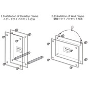 2.【壁掛け方&机置き方】:縦置きか横置き、フレームを支えてる支柱の位置を変えると置き方が変えられます。ワイヤーをフレームに装着すると壁に掛ける事が出来ます。
