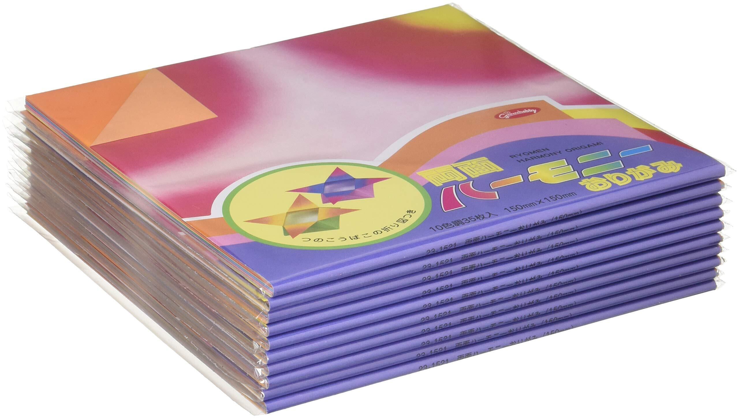 1セットあたり35枚入り。150ミリ、両面おりがみ、10色調35枚入り つのこうばこの折り図つき。