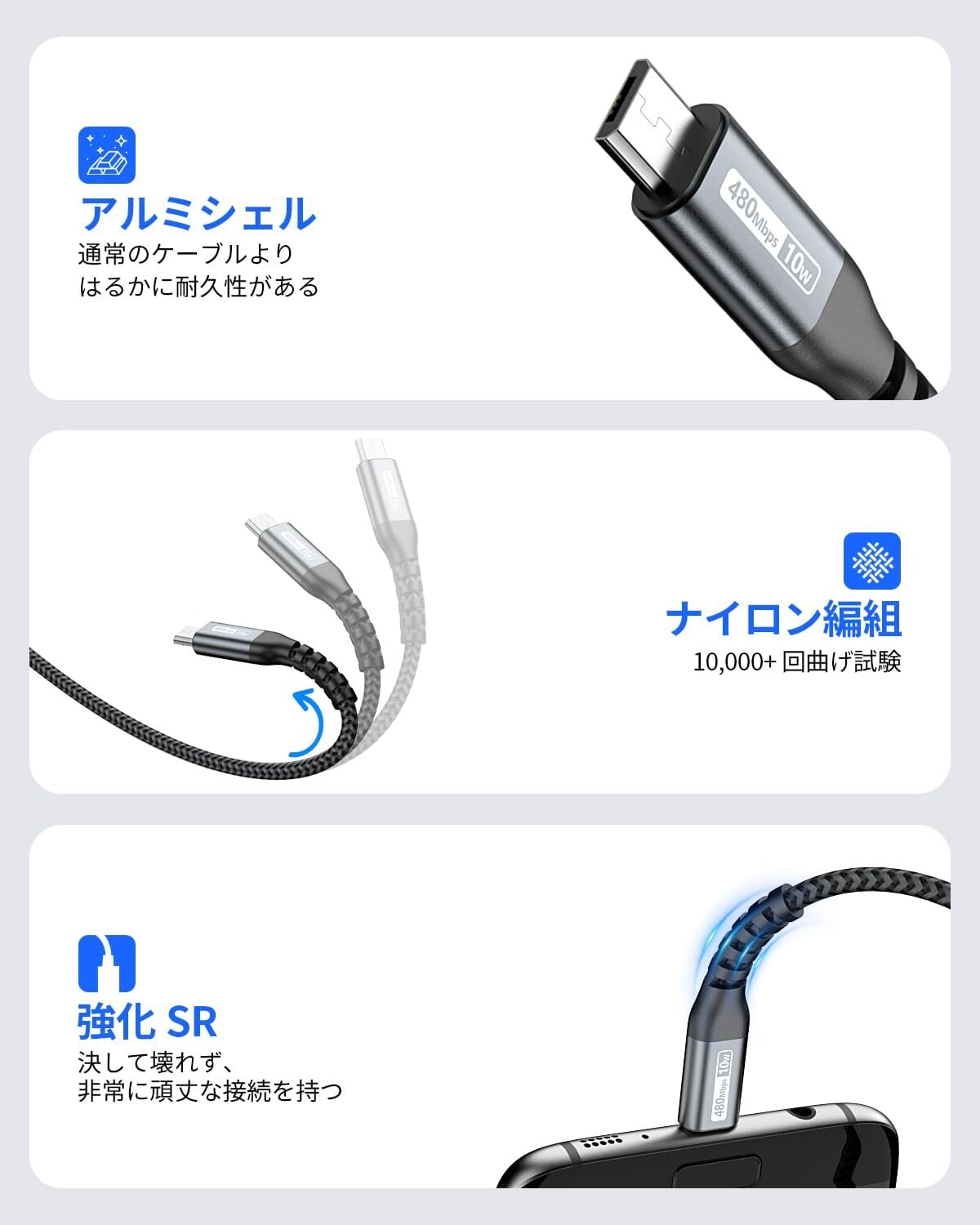 【充電&データ同期】充電&データ同期に対応できますので、最大480Mbpsの高速データ転送が可能です。USB-C (Type C)ポートはホスト側です。️ご注意:OTG対応の場合、二台のデバイスともOTG機能を持つのが必要です。また、USB-C端末(ホスト側)からMicro端末へのデータ転送のみをサポートします(逆転送できません) ※映像出力は非対応です。