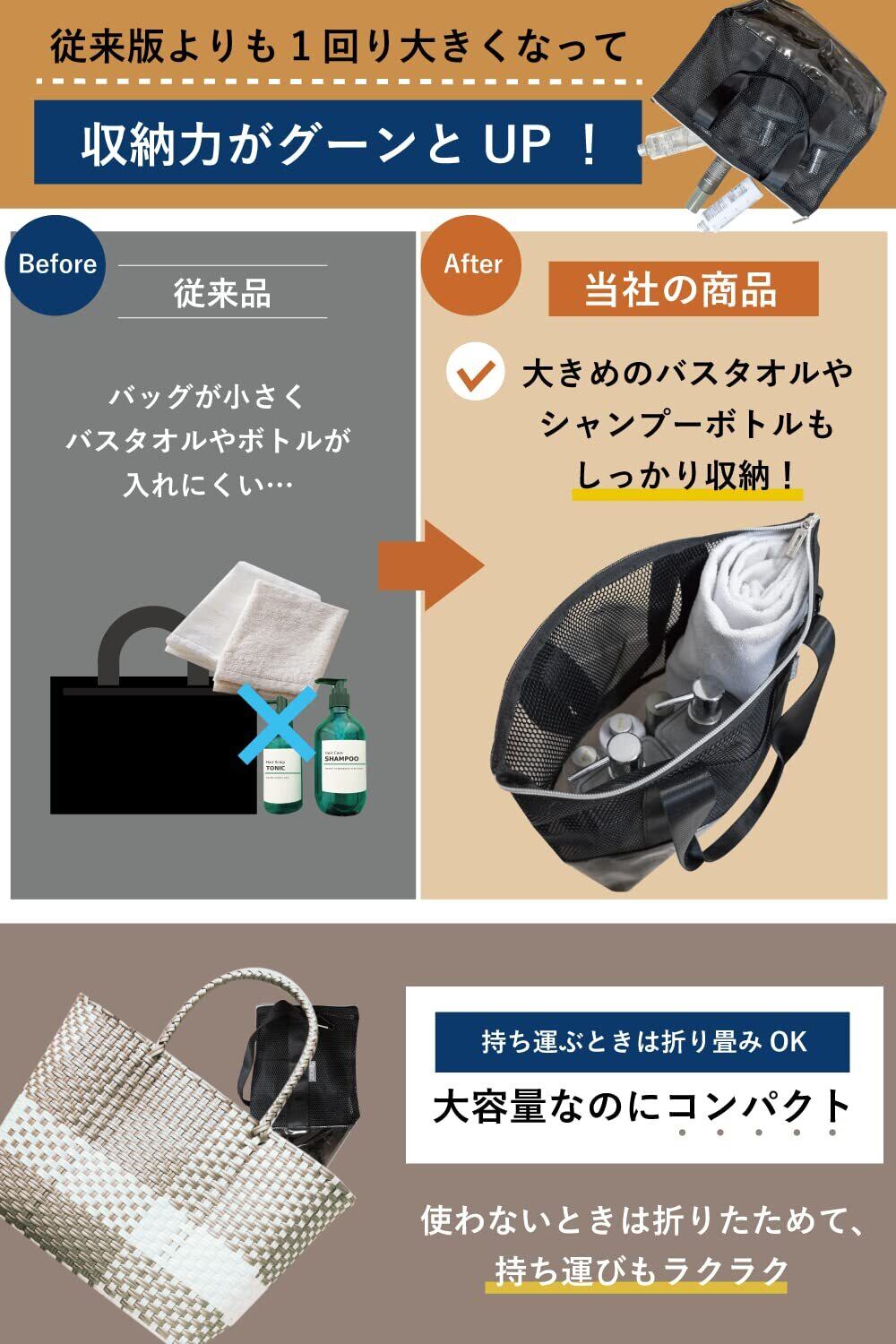 従来版よりサイズアップ:従来版よりもサイズが大きくなり、バスタオルからシャンプーボトルまでしっかり収納できる大容量バッグです。折り畳みできるため持ち運びのときは嵩張りません。