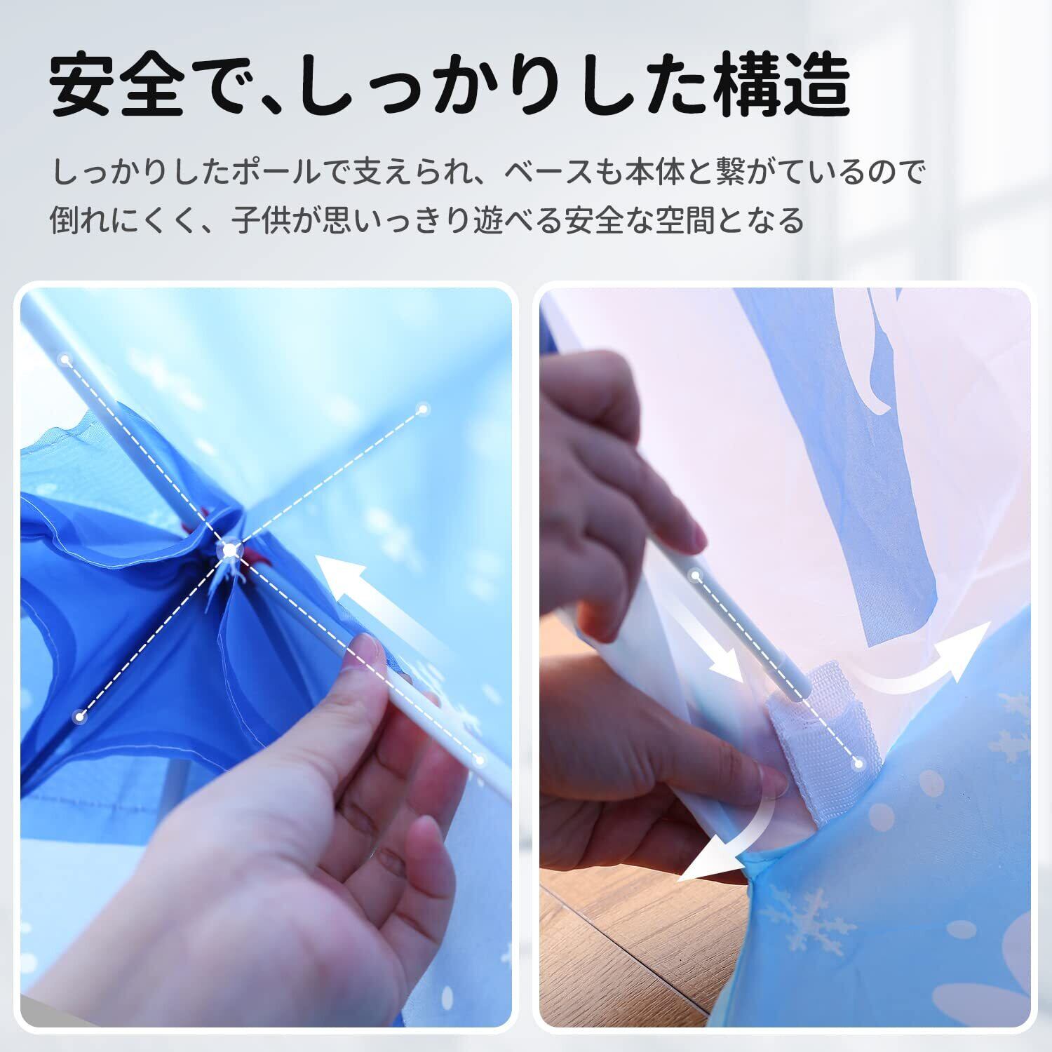 【安全な構造&材質】滑らかで、しっかりしたポールで支えられ、テント内部で遊んでも怪我をする心配がありません。本体が無毒、柔らかい材質で作られ、汚れた時にも洗いやすいです。また、側面にも通気性が良い窓が付き、子どもに対して安全安心なテントす。