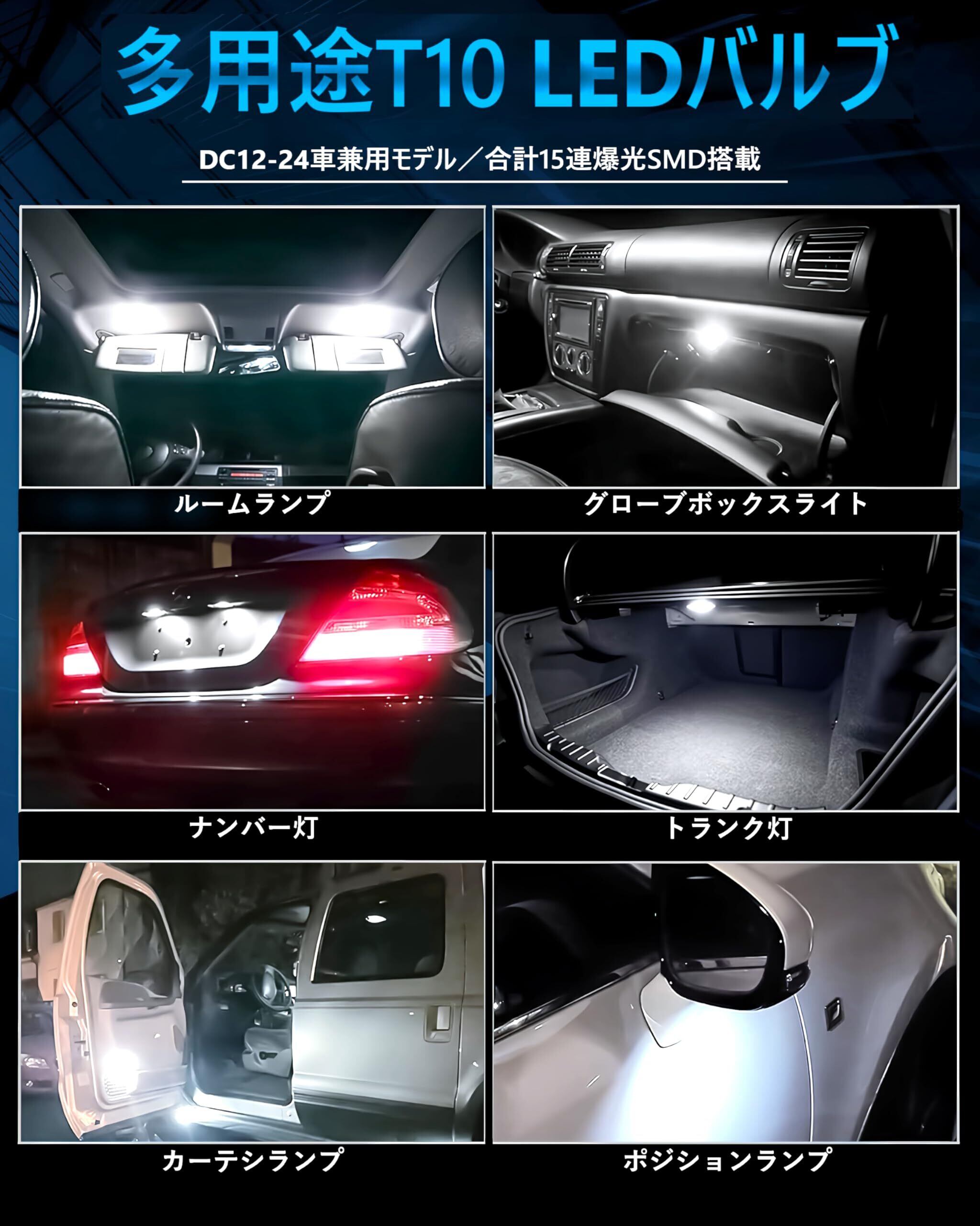 【正真正銘爆光T10LEDバルブ】ポジション、ルームランプ、バックランプ、ナンバー灯、ライセンス、ドア下ランプ、トランクルームなどに最適なLEDバルブです。特注の明るいLEDチップ16基搭載、全方向に15連照射することでリフレクターの効果を活かし明るさを増します。純正T10ハロゲンと同等の大きさです。