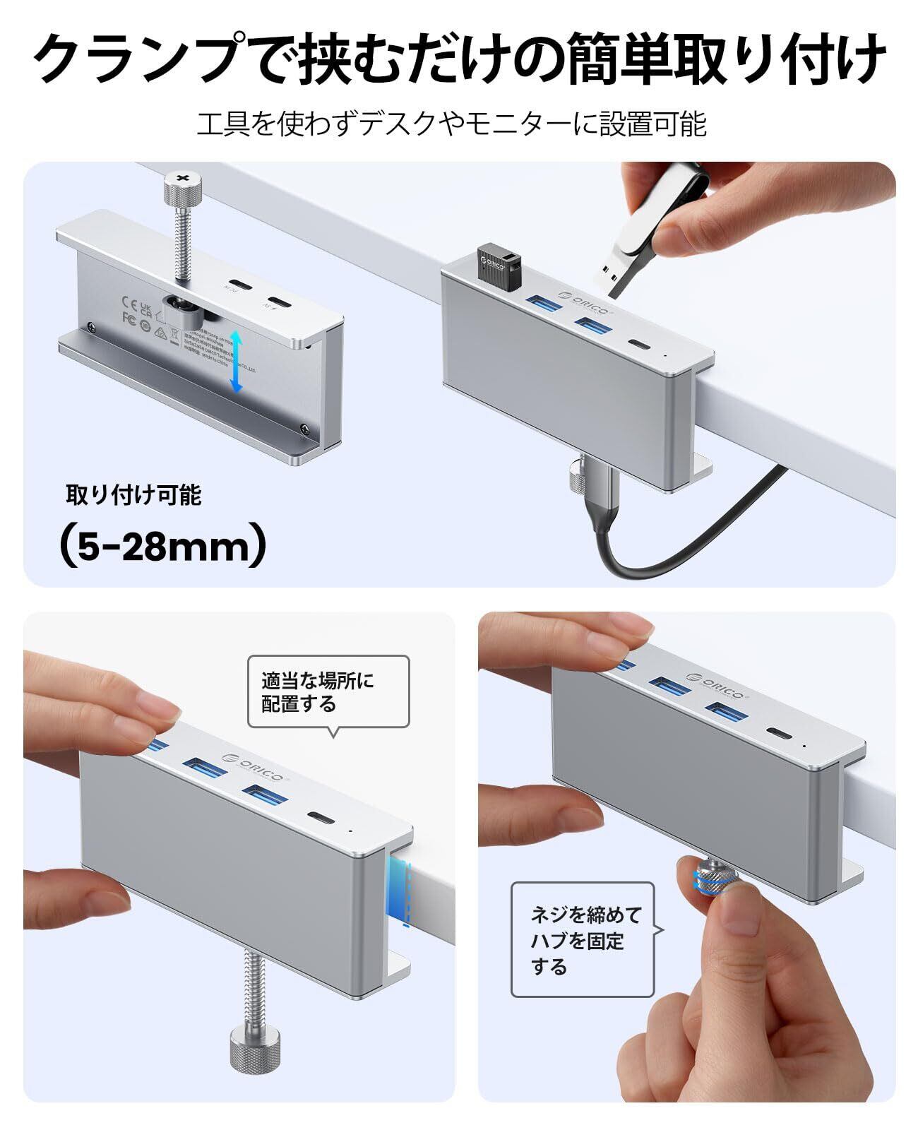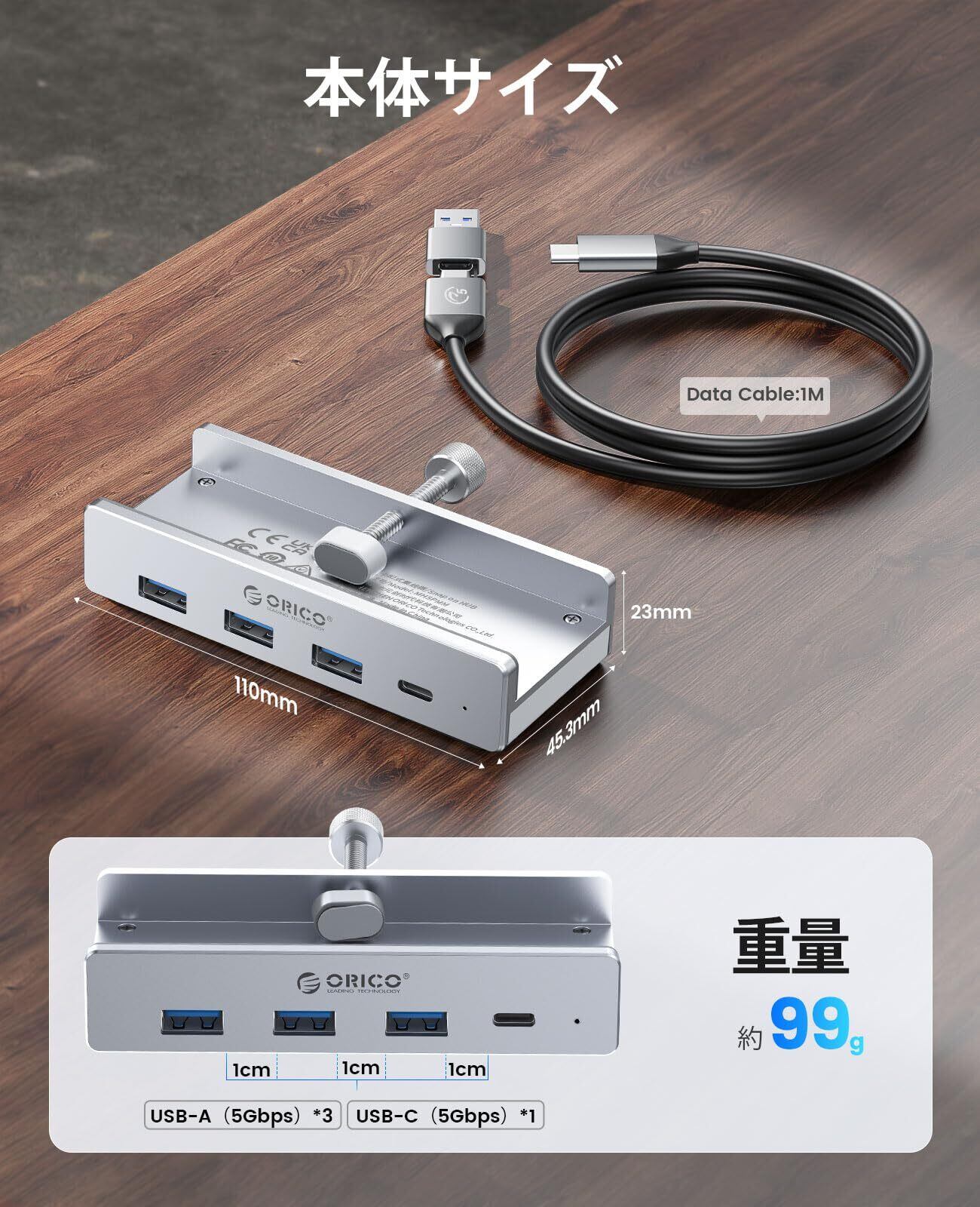 ORICO USB C ハブ クランプ 固定 usb hub 3.0 4ポート 5Gbps高速転送 USB-C 給電ポート付き(5V/3A) バスパワー/セルフパワー両対応 2-IN-1 1mケーブル付き アルミ クリップ式 USB拡張 USB増設 Windows/Linux/Mac OS対応 テレワー 在宅勤務 シルバー MH4PC