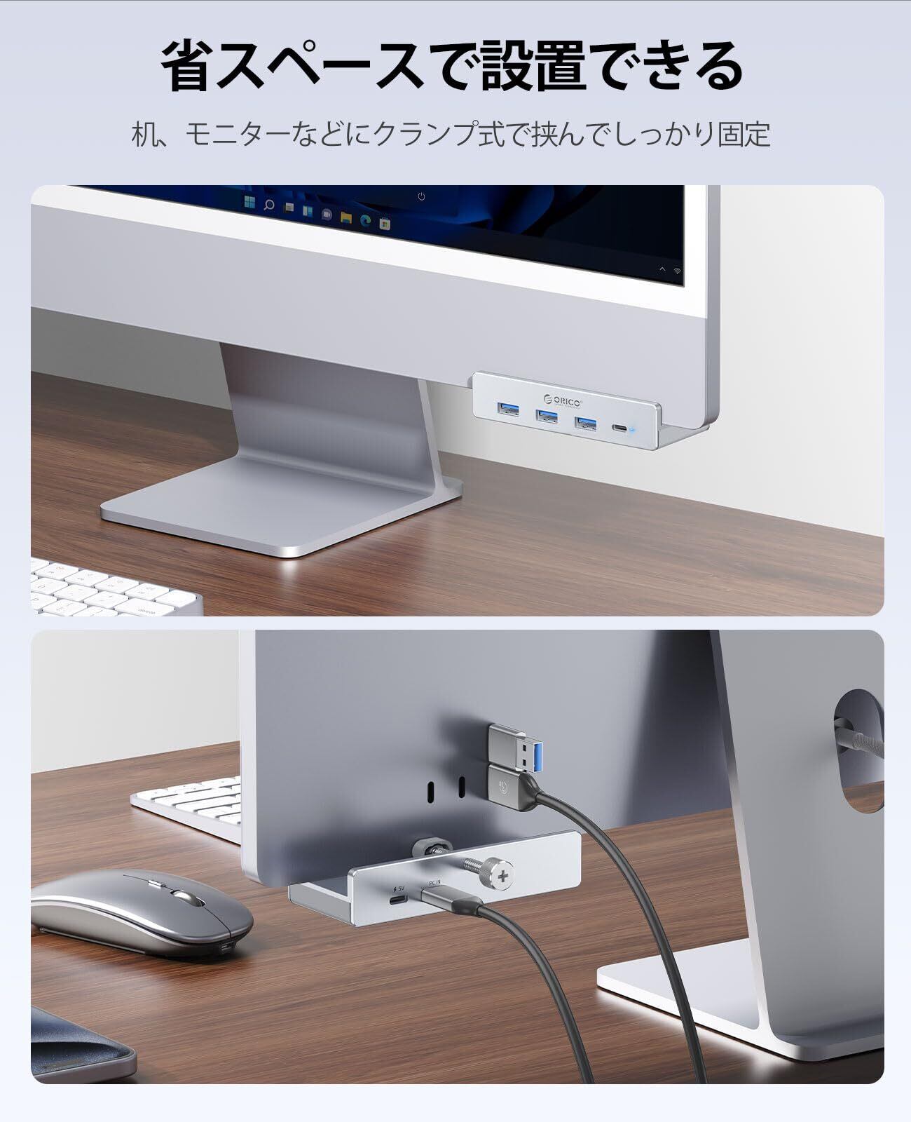 ORICO USB C ハブ クランプ 固定 usb hub 3.0 4ポート 5Gbps高速転送 USB-C 給電ポート付き(5V/3A) バスパワー/セルフパワー両対応 2-IN-1 1mケーブル付き アルミ クリップ式 USB拡張 USB増設 Windows/Linux/Mac OS対応 テレワー 在宅勤務 シルバー MH4PC | BASE SHOP
