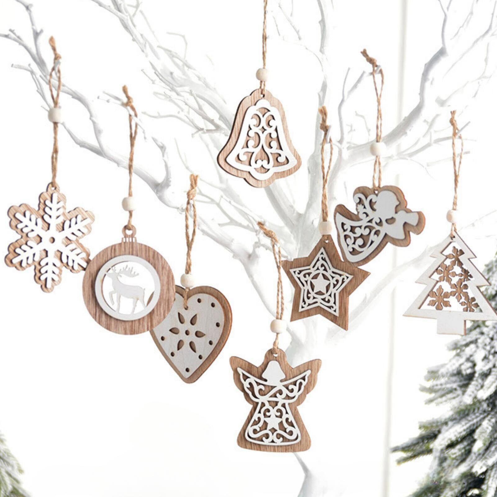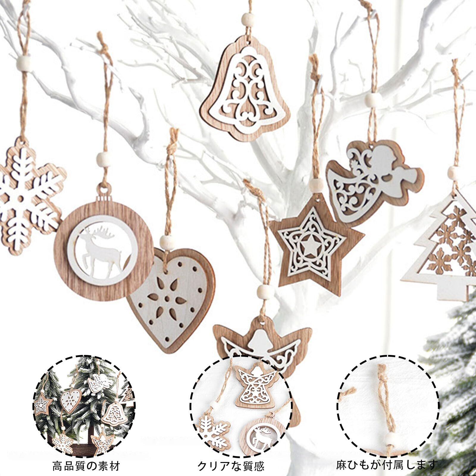 クリスマス オーナメント 木製 8枚 クリスマスツリー 飾り 木製スライス 雪の結晶 トナカイ ベル クリスマスツリー 天使 星 ハート 二層 木材チップ 天然木製 手作り 撮影用 装飾用 小物 DIYクラフト用品 (C 8枚)