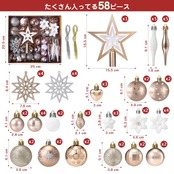 【大容量58個セット】入数:クリスマスツリー飾り×58個、サイズ:3~8㎝、たくさんありますのでこのセットだけで、大きいサイズのツリーをオシャレで豪華に装飾することができます。