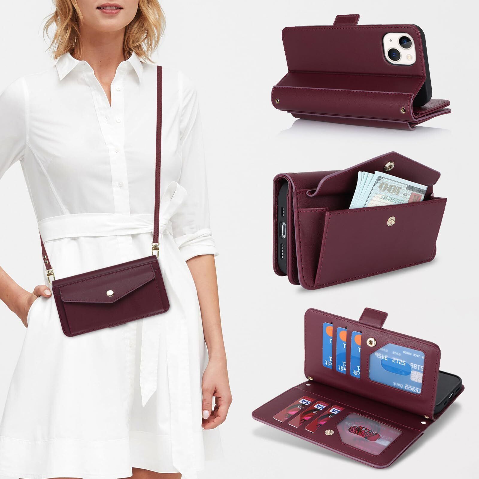 【Hamany】 いphone14 ケース 手帳型 スマホ ショルダー iphone 14 ケース カード収納 大容量 スマホケース iphone 13 スタンド機能 財布型 耐衝撃 耐久性 全面保護 女性 肩がけ 首掛け 斜め掛け ショルダー 携帯カバー -ワインレッド