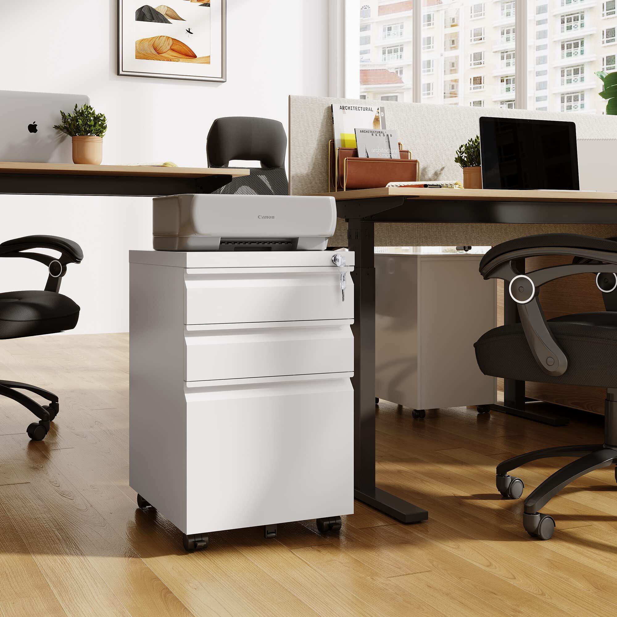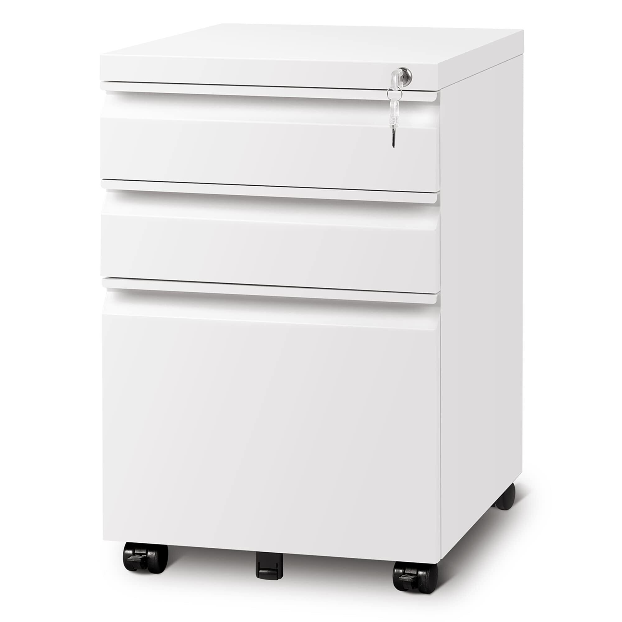 DEVAISE デスクワゴン サイドワゴン キャビネット オフィスワゴン 袖机 キャスター付き 鍵付き 3段オールロック 大容量 A4対応 幅390*奥行480*高さ600mm 丈夫なスチール製 サビ止め塗装 ホワイト | BASE SHOP