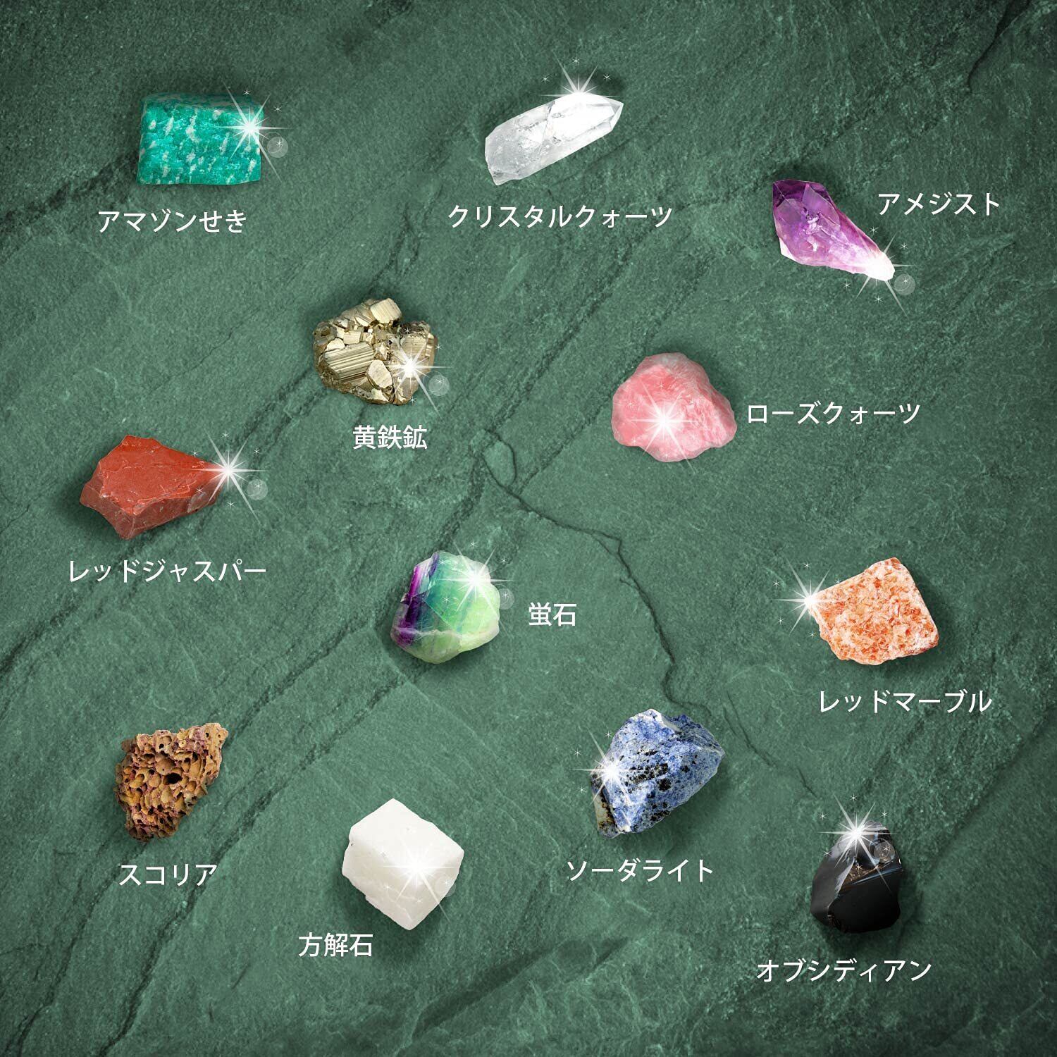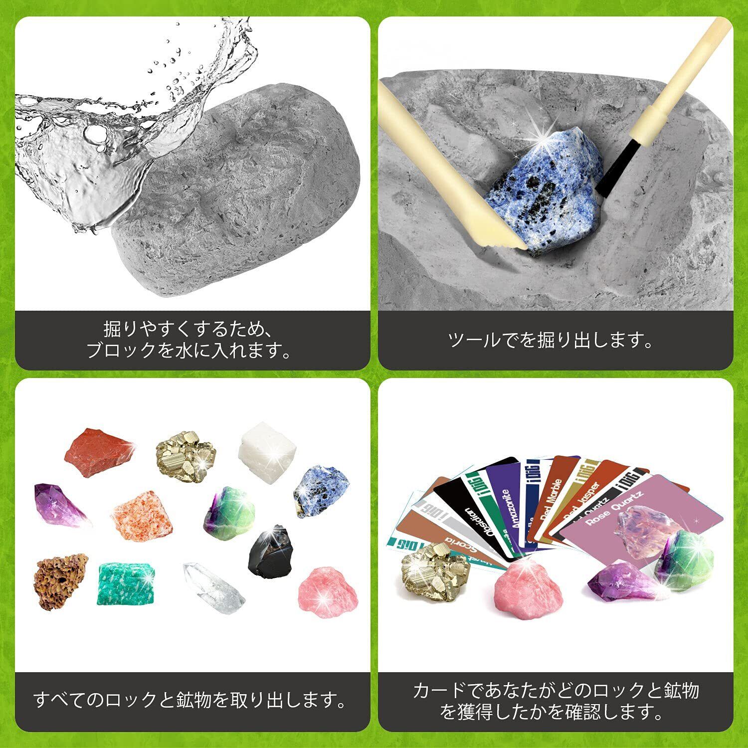 XXTOYS 鉱石発掘キット:12個ブロック(12種の鉱石を込み)、24つの発掘ツール、1枚のポスターと12枚の学習カードを含みます。すべてのブロックは、発掘ツールがついています。提供するツールでブロックを掘って、鉱石を掘り出したら、ポスターと学習カードを使って、それらに関するものを学びましょう!中では、アメジスト、ローズクォーツ、蛍石など有名な鉱石を見つけてください