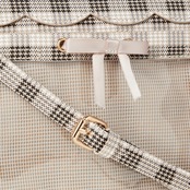 表はひねりの金具使いで上品に、裏のクリアポケットにはメッシュシートが付属しているので缶バッチなどが付けられます
