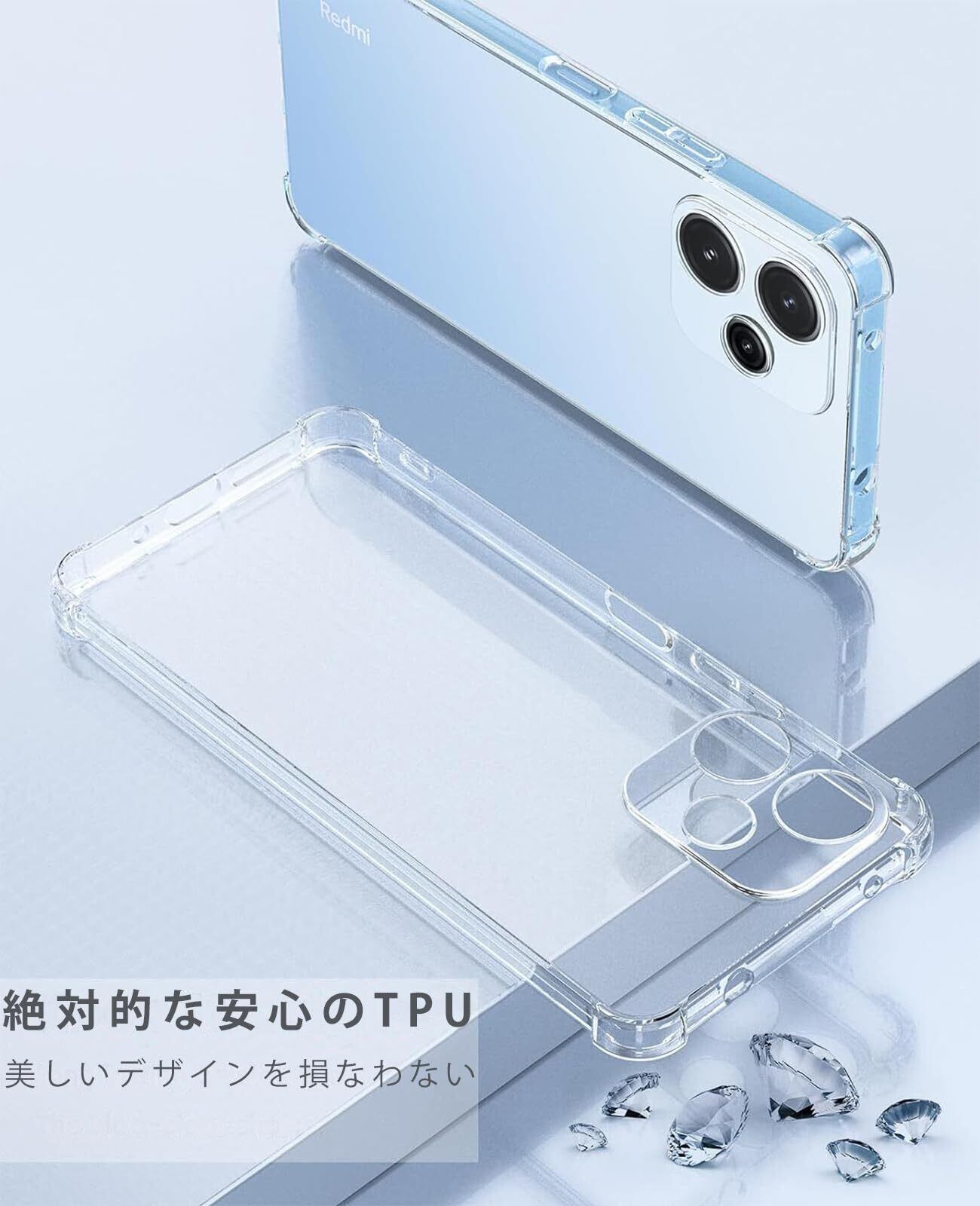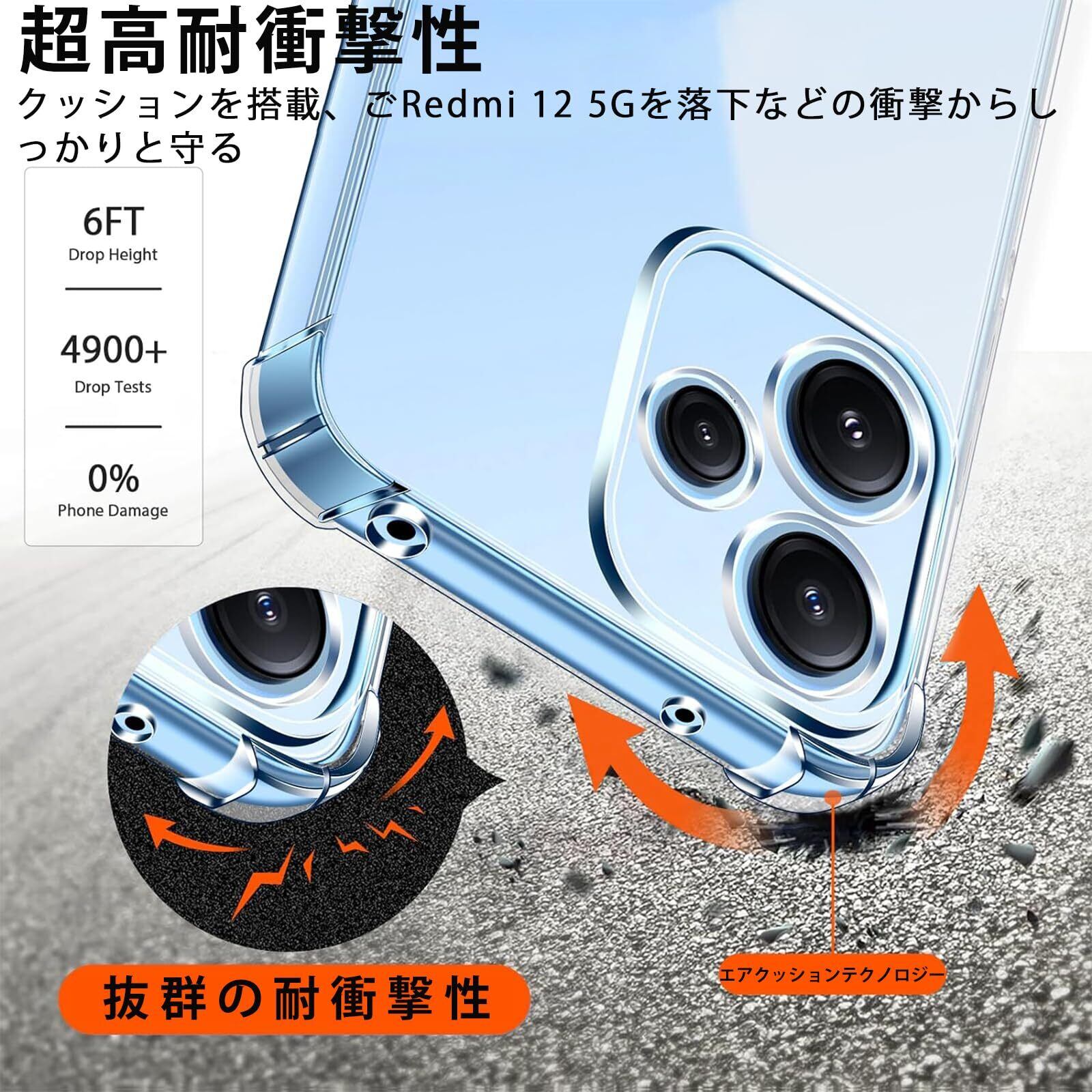 【高い透明度】 透明度が高く、鮮やかな色をそのまま映し出すことができ、 本体のオリジナルのカラーを損ねません。ケースの端はダイヤモンドカットプロセスを施すことでより洗練された美しい外観となっています。Xiaomi Redmi 12 5G の美しさはそのままに、保護しているのです。
