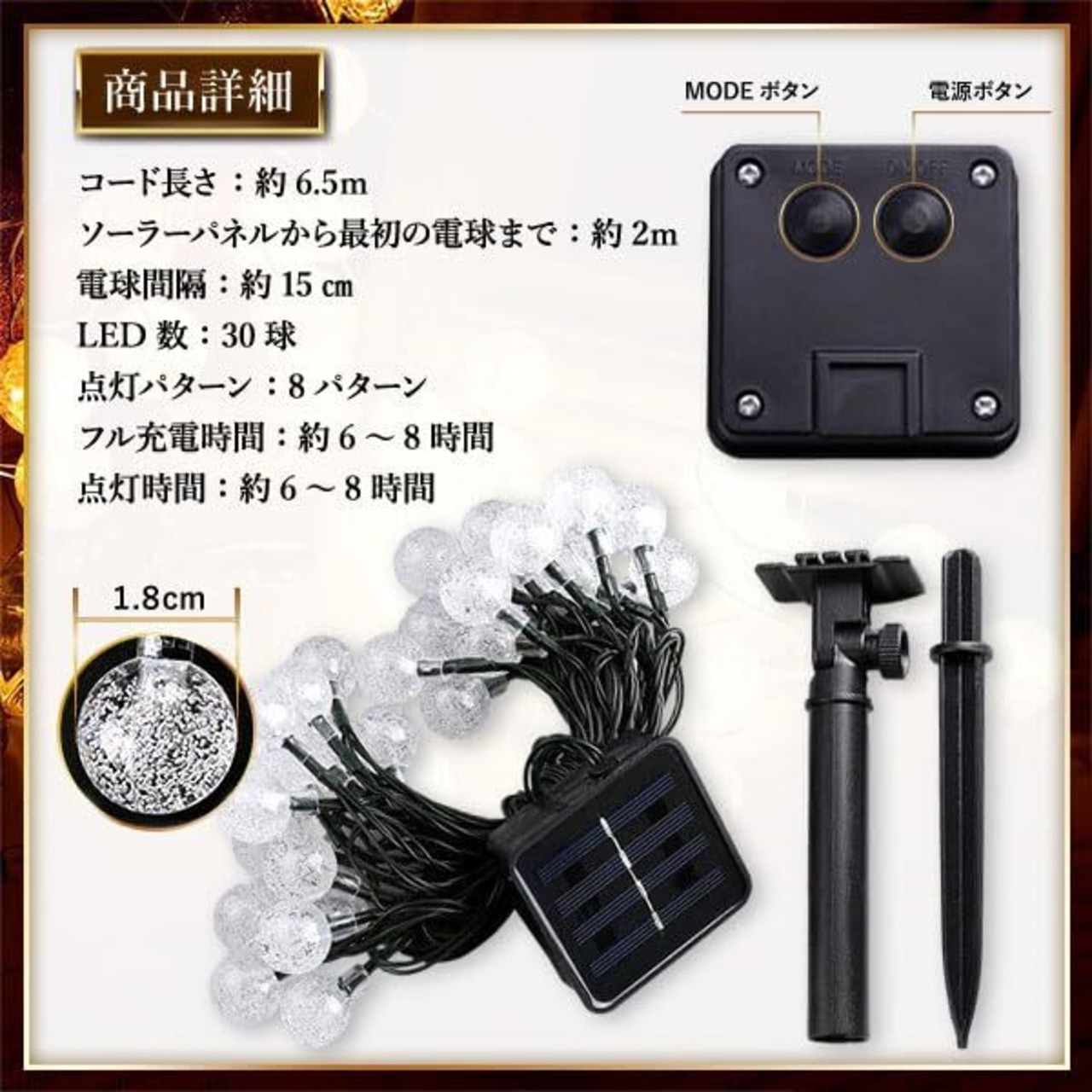 サイズ:コード長さ:約6.5m、ソーラーパネルから最初の電球まで:約2m、電球サイズ:直径約1.8cm、電球間隔:約15cm