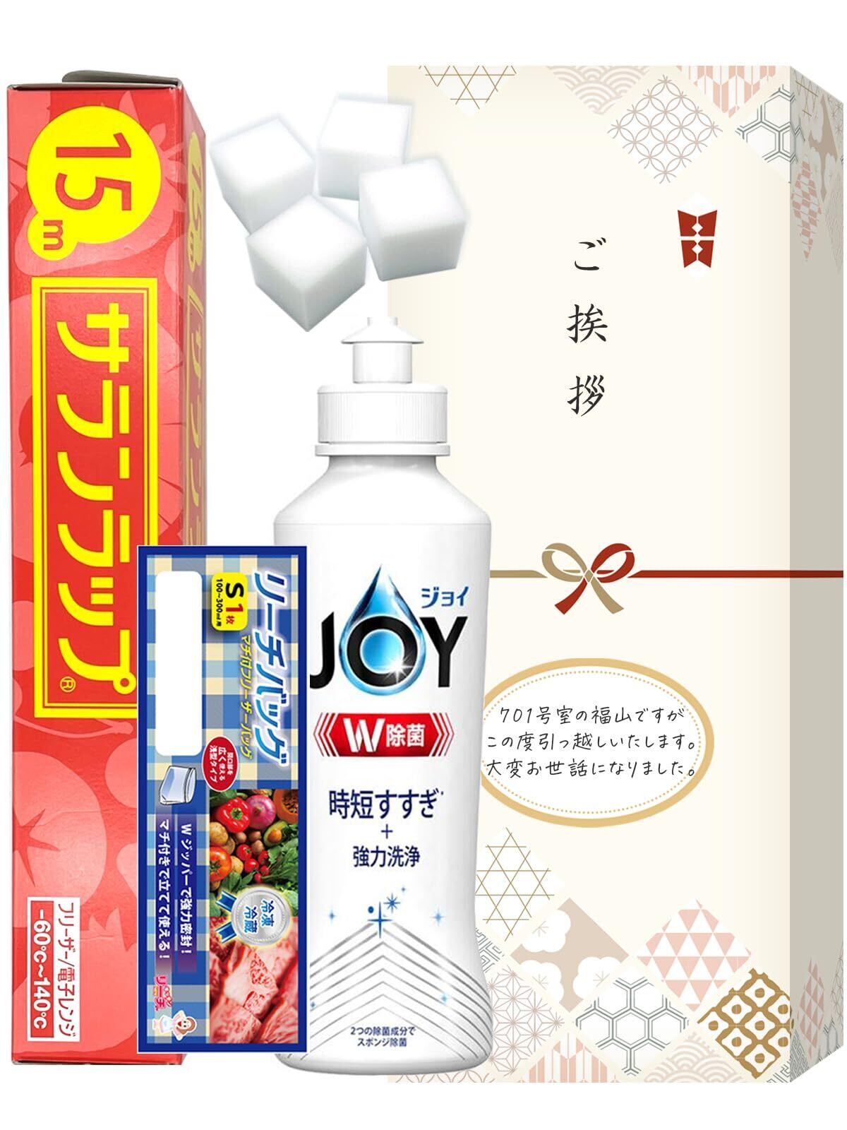 【中身は安心の有名ブランド】中身は貰ったお相手が困らない、キッチングッズの消耗品4点セット 性別・年齢にも左右されない、誰もが知っている有名ブランド商品を一つ一つ厳選してチョイスしておりますので、渡すお相手にも失礼がありません。 それぞれの商品で最も高いシェアを誇る有名商品の旭化成社製食料品ラップやP&G社製食器用洗剤ジョイなどをご用意いたしました。 また、あって便利なリーチバッグ、レック社製メラミンスポンジもあわせてお入れさせていただきました。