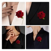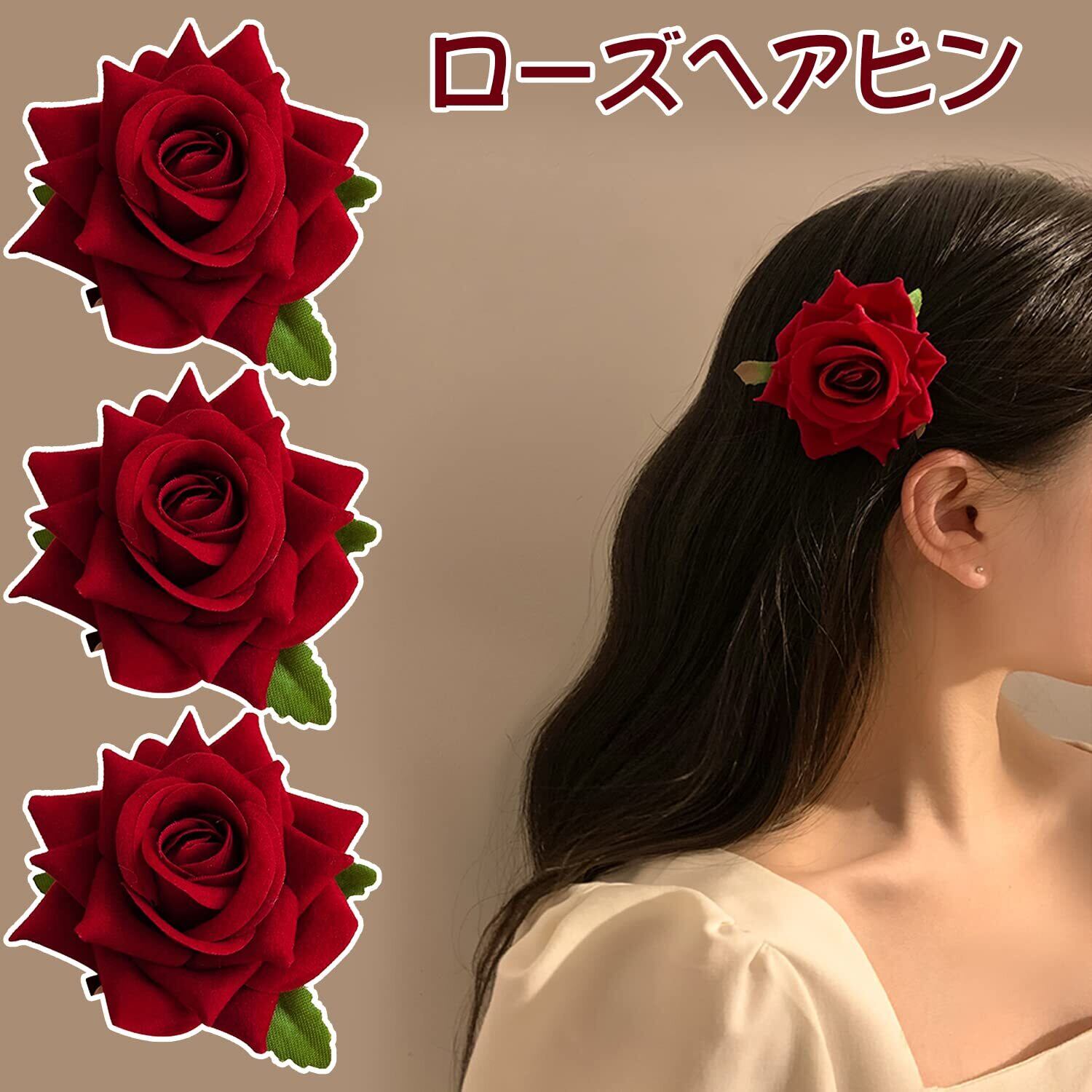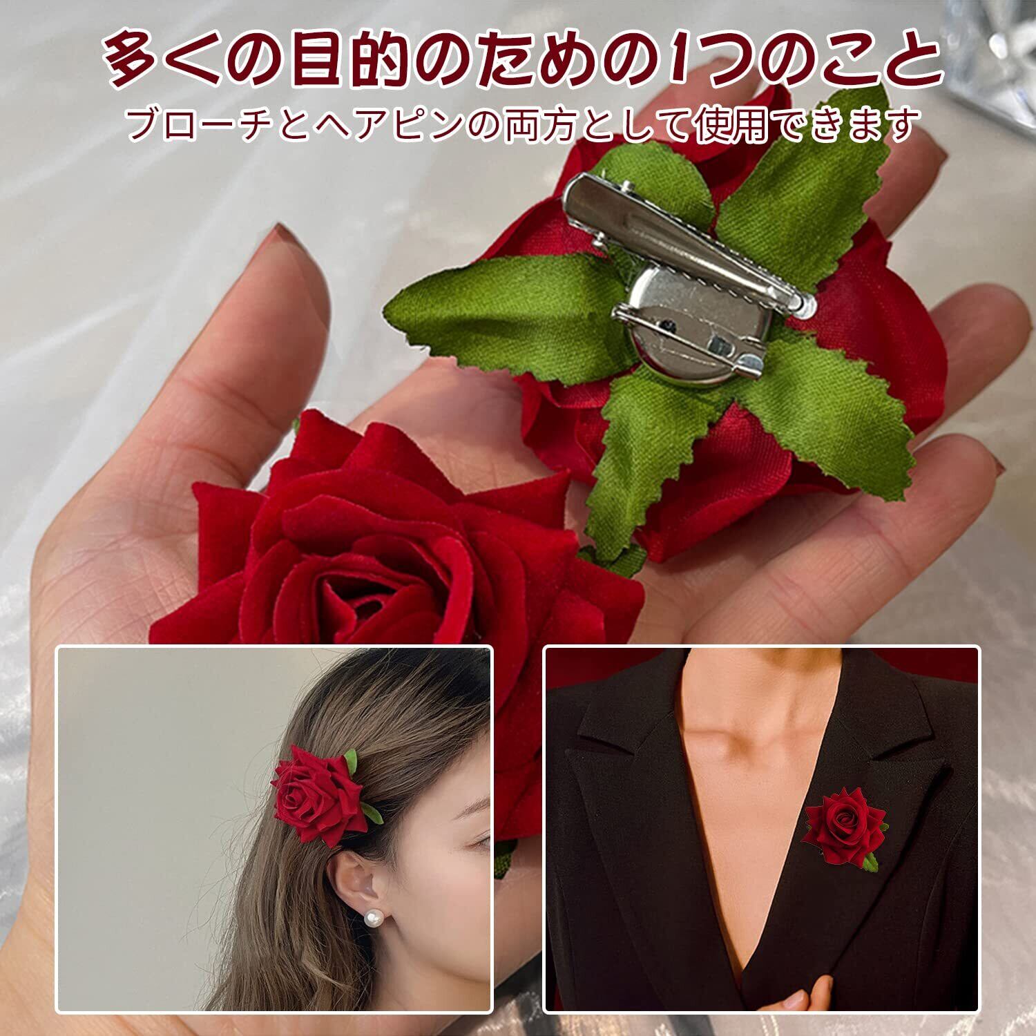 【セットには】各セットに3つの赤いバラのヘアピンが付いています。バラの花はヘアピンとブローチの裏地に使われている。髪のどこにでも固定できるヘアピンと、服に使えるピン。