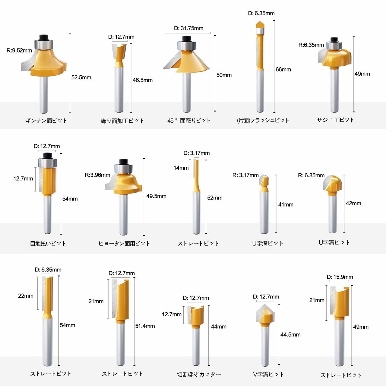 ▲15本組, 色: イエロー, シャンク径: 6㎜。溝ほり 面取り 飾り面加工用。ルータービットの刃部にYG6Xタングステン鋼合金を採用し&表面塗装, 切削力に優れ美しく仕上げられます, 最大の強度と耐久性を実現ことができます。