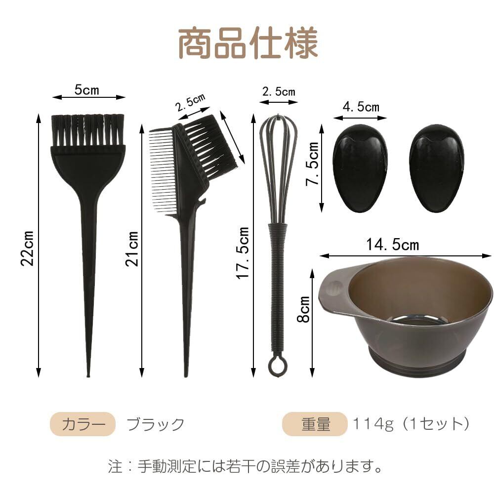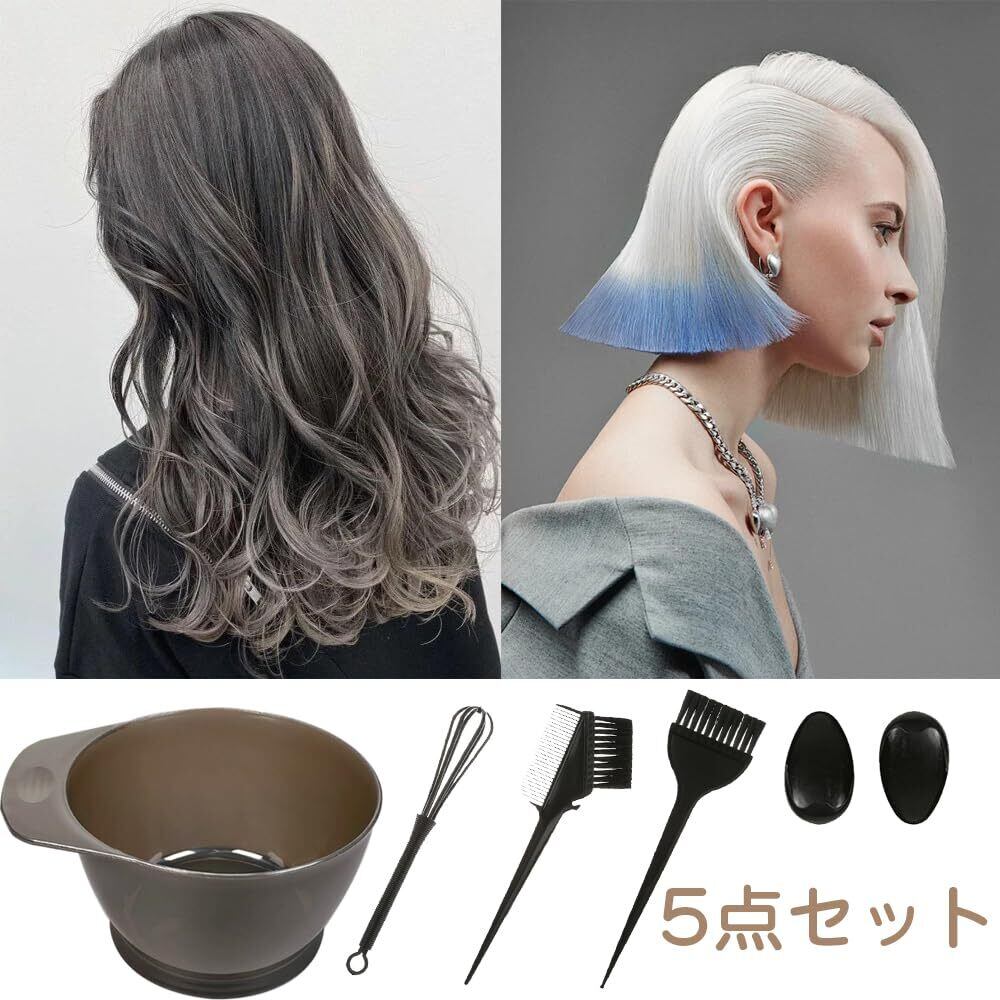 【セット内容】ヘアダイブラシ、耳カバー、ヘアカラーボウル、コーム、ホイッパ、計5つのアイテムが含まれています。