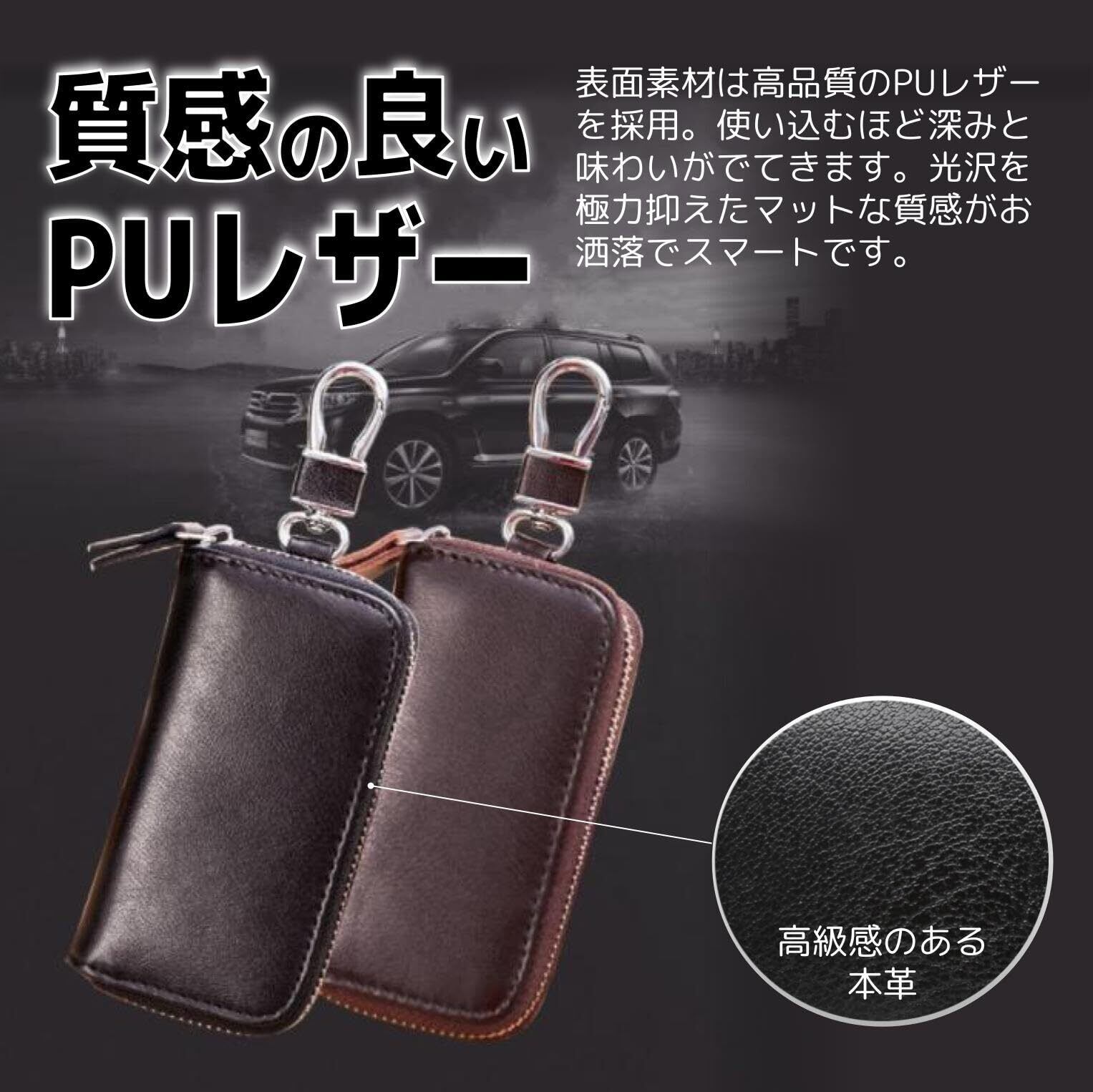 【カラー】PUレザーの質感を生かした13カラーのラインナップです。 Black (ブラック) / Navy (ネイビー) / Red (レッド) / WineRed (ワインレッド) / Brown (ブラウン) / DarkBrown (ダークブラウン) / Pink (ピンク) / DeepPink (ディープピンク) / CreamYellow (クリームイエロー) / MintGreen (ミントグリーン) / TurquoiseBlue (ターコイズブルー) / RoseQuartz(ロースクォーツ) / RosieBrown(ロージーブラウン)【商品詳細】サイズ:11 x 6 x 2.5cm/カードスロット✕2/キーフック✕6/キーチェーン✕1/スマートキースロット✕1