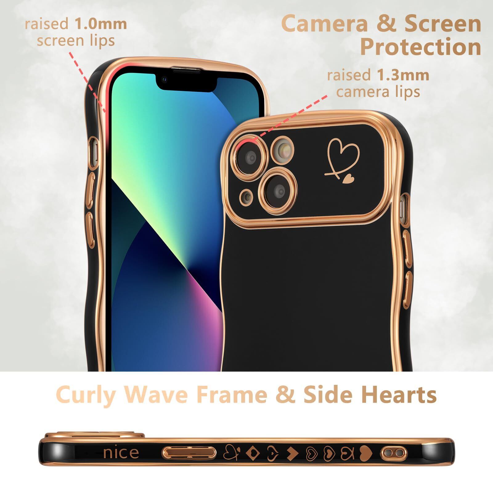 ZTOFERA iPhone 13 用 ハートケース 人気 おしゃれ iPhone 13 波型ケース 柔軟な TPU シリコン ウェーブ デザイン スマホケース メッキ加工 ソフト 軽量 耐衝撃 韓国 可愛い アイフォン 13 ケース 女子 女性 携帯電話カバー ワイヤレス充電対応 (ブラック) | BASE SHOP