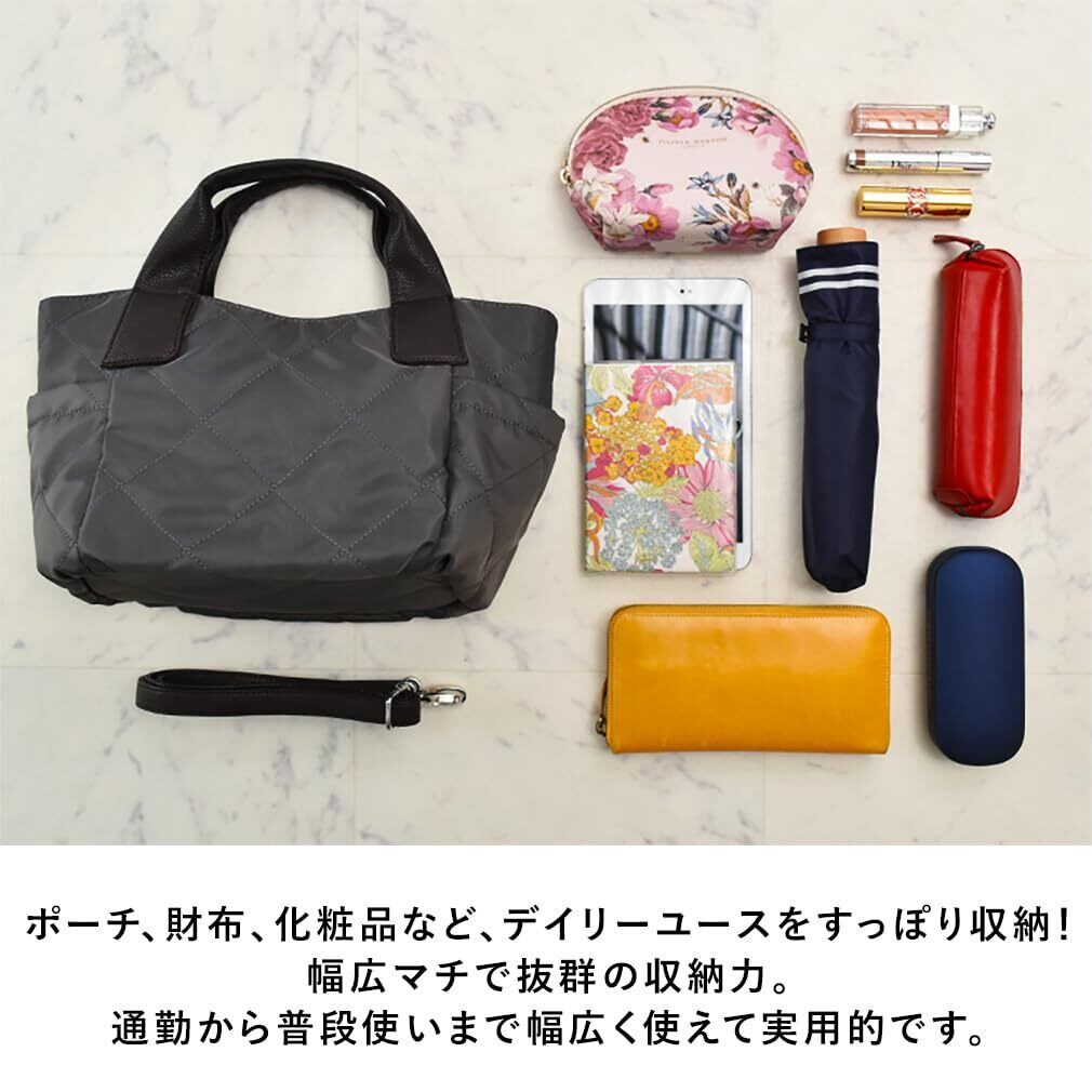 大きめのキルティングが女性らしい2wayトートバッグ。 キルティング加工を施した丈夫な高密度ナイロンを使用し、上品で優しい雰囲気のバッグに仕上げました。 しっかりとマチが広く、普段使いはもちろん通勤バッグとしてもオススメです。 付属のショルダーベルトで肩掛け・斜め掛けができるのもお仕事バッグには必要なポイント。 シボのあるフェイクレザーのハンドルを合わせ、ナイロンとのコンビにすることでまとまりのあるデザインに。