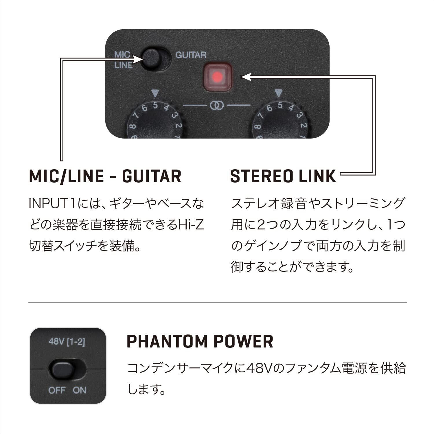 『AMS-24』は、ソロのライブ配信や宅録に最適なモデルです。低ノイズプリアンプを搭載するXLR/TRSコンボ入力を2系統、ヘッドフォン出力を2系統、外部モニター用TRS出力を2系統装備しています。