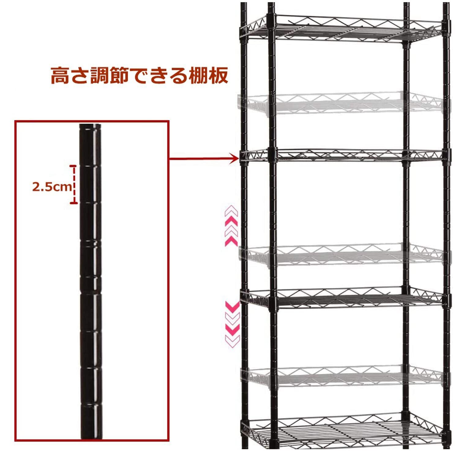 【高さ調節できる棚板】全6段の棚板で充実の収納力、スチールフレームでしっかりとした耐久力を持ち、キッチン周りをひとつにまとめて快適にお使いいただけます。ポールに入った2.5cm間隔の溝で棚板の高さが変えられるので、収納する物に合わせて、ムダなく最適なスペースで収納できます。