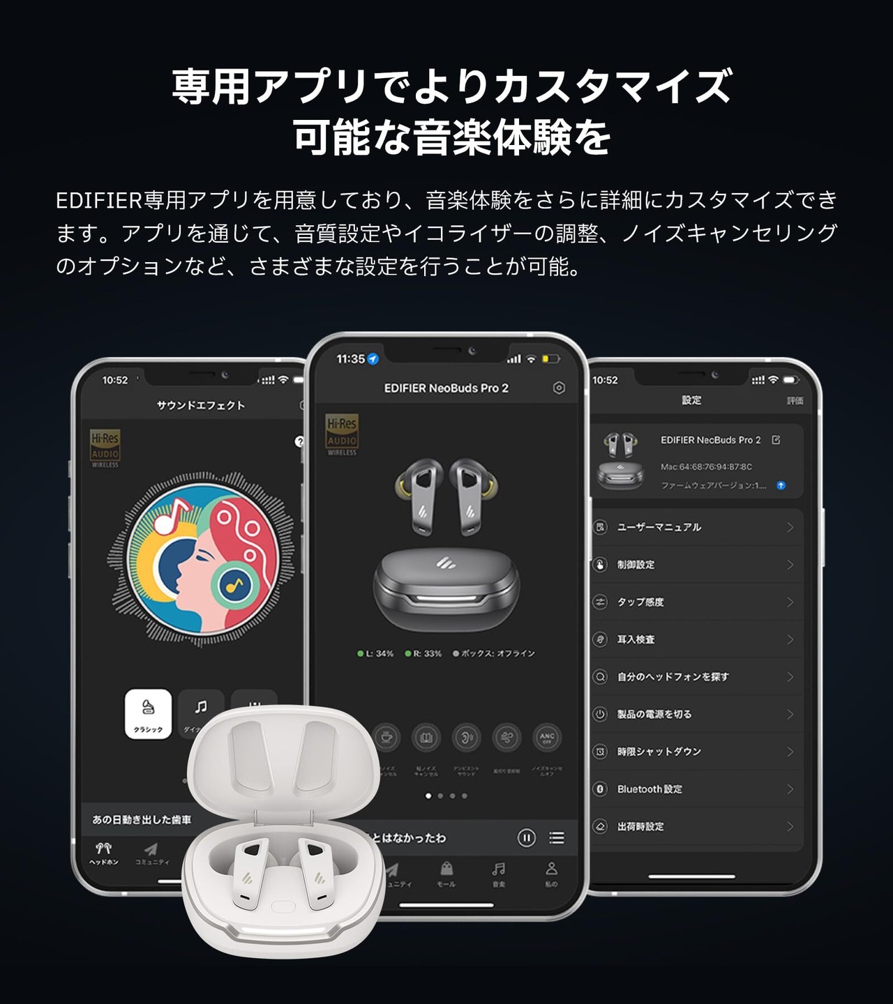 Edifier Neobuds Pro2-50dBノイズキャンセリング ワイヤレスイヤホン(AAC対応) ハイレゾ LDAC&LHDC対応/360°空間オーディオ/急速充電/ゲームモード/Blueooth 5.3/専用アプリ/装着検出機能/IP54防水規格/8マイクAI通話ノイズキャンセル ブラック | BASE SHOP