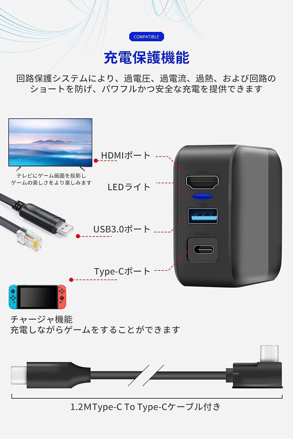 3in1多機能 switchドック HDMI 変換アダプター 45W 急速充電 Type-c充電器(HDMI/USB 3.0/TYPE-C)ACアダプター PSE認証済 過電流保護 コンパクト switch ドック代用品 switch oled/iPhone15対応 TVモード 1.2M Type-Cケーブル付き(ブラック)