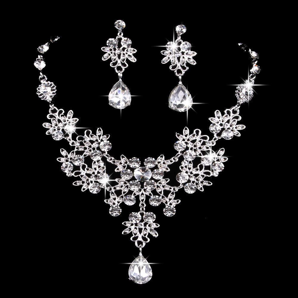 大粒クリスタルガラスとラインストーンをふんだんにあしらったゴージャスなファッションジュエリーです。ネックレスとピアスの2点セットにてお届けいたします。眩いばかりに煌く上品な雰囲気はあらゆるパーティ・フォーマルシーンであなたの装いをより一層演出し輝かせます。 水晶のような多彩な輝きを放つストーンときらめくラインストーンでお顔周りを華やかにかつエレガントに演出します。 パーティー、結婚式、ウェディング、二次会、その他のフォーマルなシーンにも、社交ダンス、ダンス用のアクセサリーとしても、また挙式後のお食事会、女子会、発表会などにもお使いいただけます。