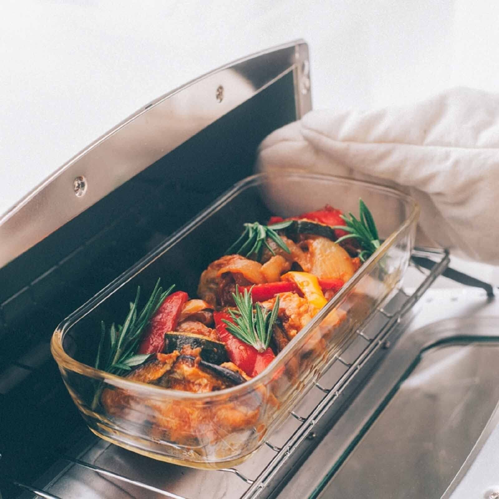 耐熱ガラスの保存容器なので、電子レンジ対応・フタを外してオーブンでも使える。より幅広い調理や保存におすすめ