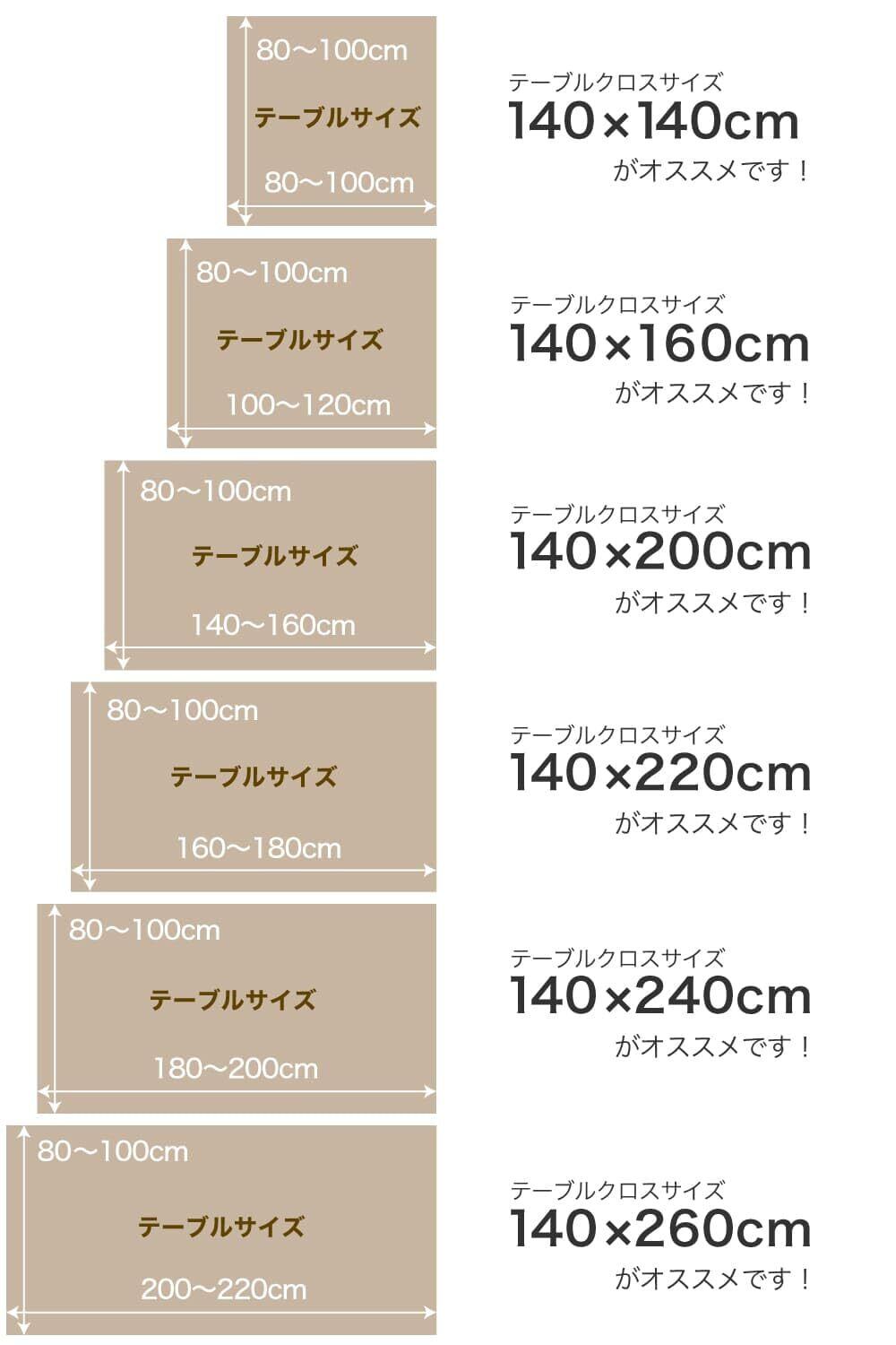 ・漂白剤や柔軟剤入りの洗剤で洗わないでください。 ・アイロンは中温以下で使用してください。 ・乾燥機は使用しないでください。 ・撥水加工は防水加工ではありません。汚れを長時間放置しておくと染みになる可能性があります。万が一こぼしてしまったらすぐに乾いた布で軽く拭き取ってください。 テーブルクロスを選ぶ際には、テーブルのサイズに合ったものを選ぶことが重要です。一般的には、テーブルの各辺より20cmから30cm程度垂らすのが良いとされています。 以下に、テーブルクロスとテーブルのサイズを組み合わせた例をいくつかご紹介します。
