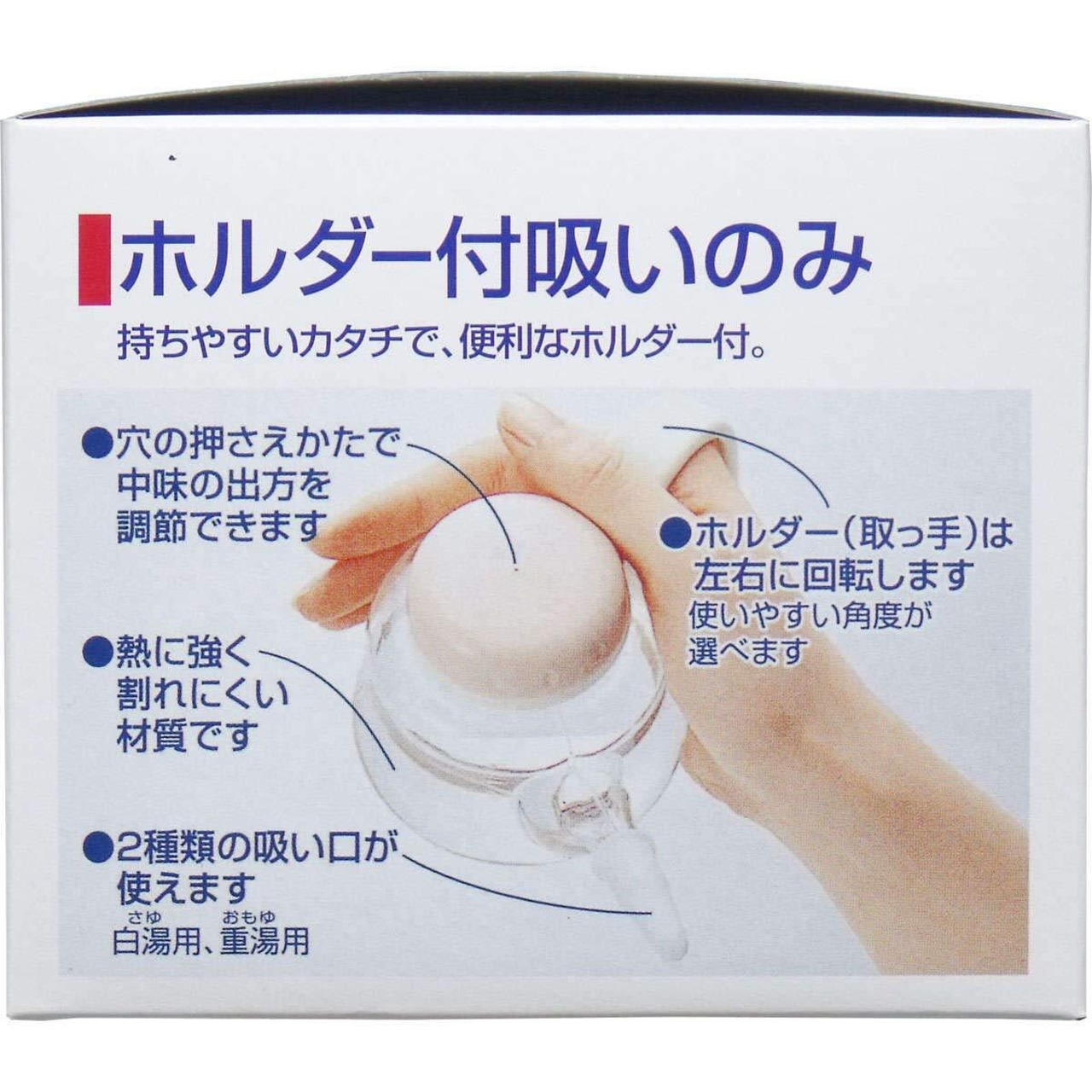 ●ご自分で使われる場合でも、介護の方が手伝ってあげる場合でも、使いやすいように大きめのホルダーが付いた吸い飲みです。