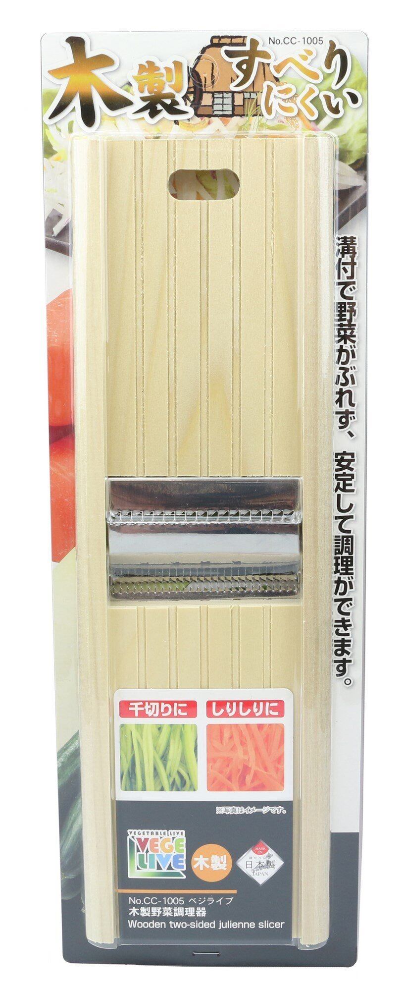 ベジライブ 木製野菜調理器 製品サイズ(約) : 80×270×15mm 製品重量(約) : 92g 刃 : ステンレス鋼 台木 : 天然木 生産国 : 日本