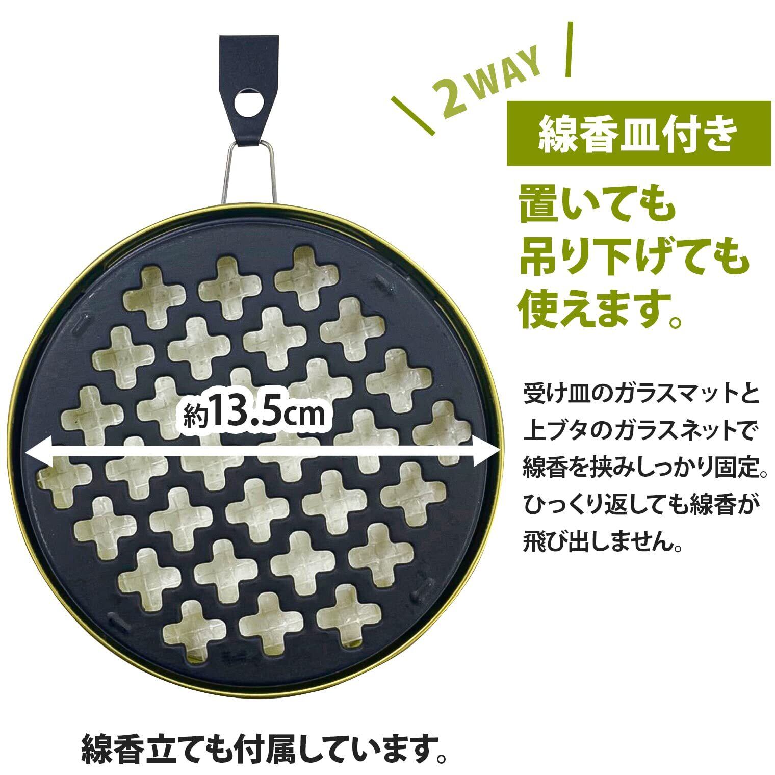 [素材・材質]<成分>メトフルトリン(ピレスロイド系) <線香皿材質>(フタ)スチール、(クロス)ガラスネット、(底)スチール、(燃焼マット)ガラスマット、(吊り下げ金具)スチール <線香立て具材質>スチール