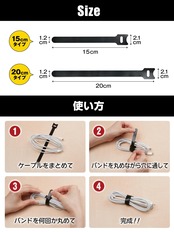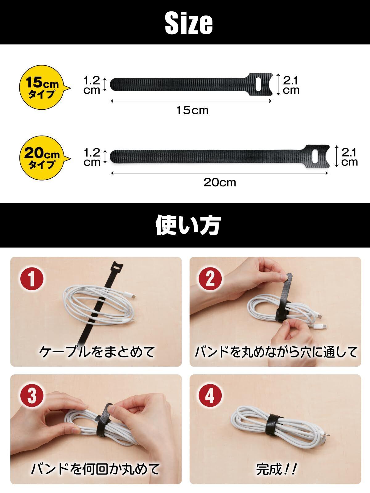 【耐久性は従来品の2倍!】 従来品は数回の使用で面ファスナーが摩耗してしまいましたが、改良を加えて100回以上付け外しが可能に!繰り返し使えるコスパの良いケーブルバンドです!【安全に使える】プラスチック製の結束バンドは切り口で怪我する危険がありますが、マジックバンド式はその心配がなく安心◎締め付け強度も調節できます。
