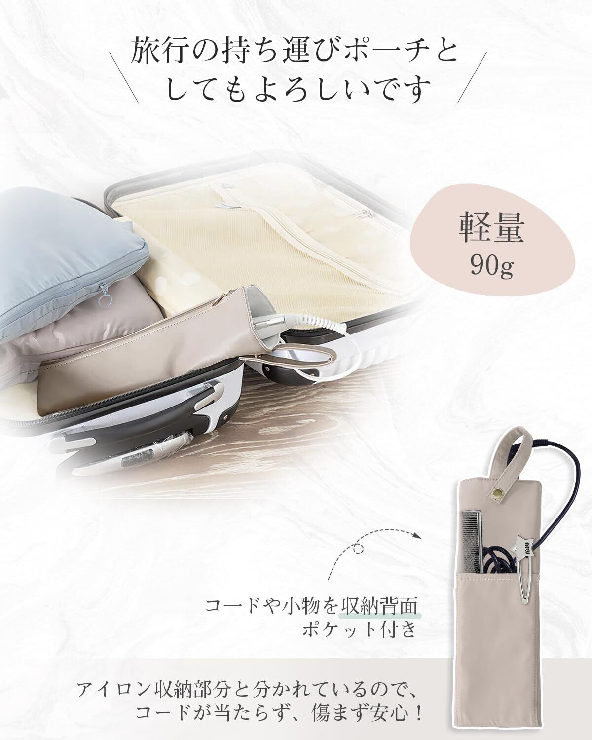 【旅行にも持ち運びポーチとして便利】厚みのある生地がヘアアイロンをしっかり保護し、旅行にも最適なポーチです。耐熱素材を使用しているので、アイロンをしまったままでも安心です。チェックアウト前でも簡単に収納し、スーツケースに入れても安心です。